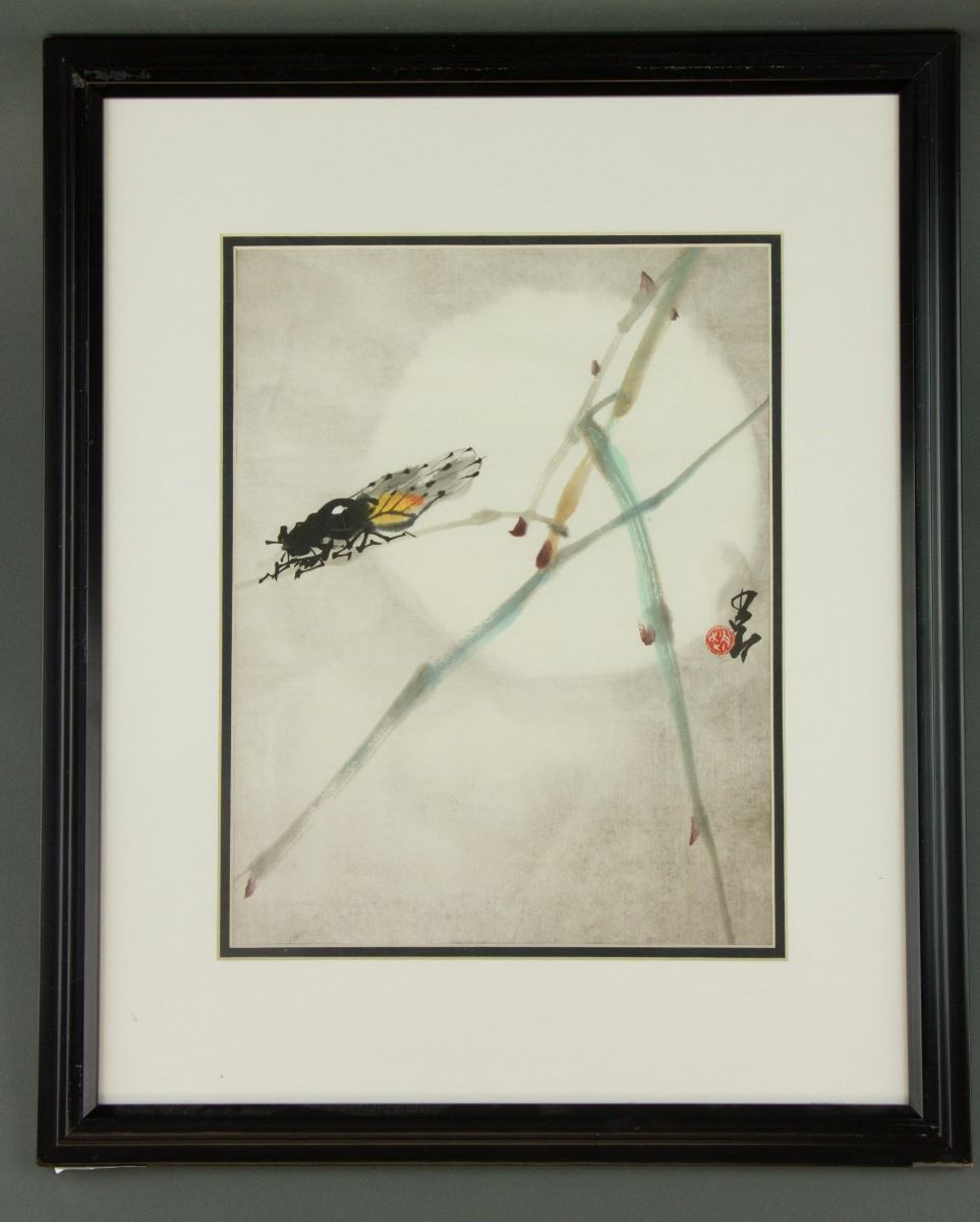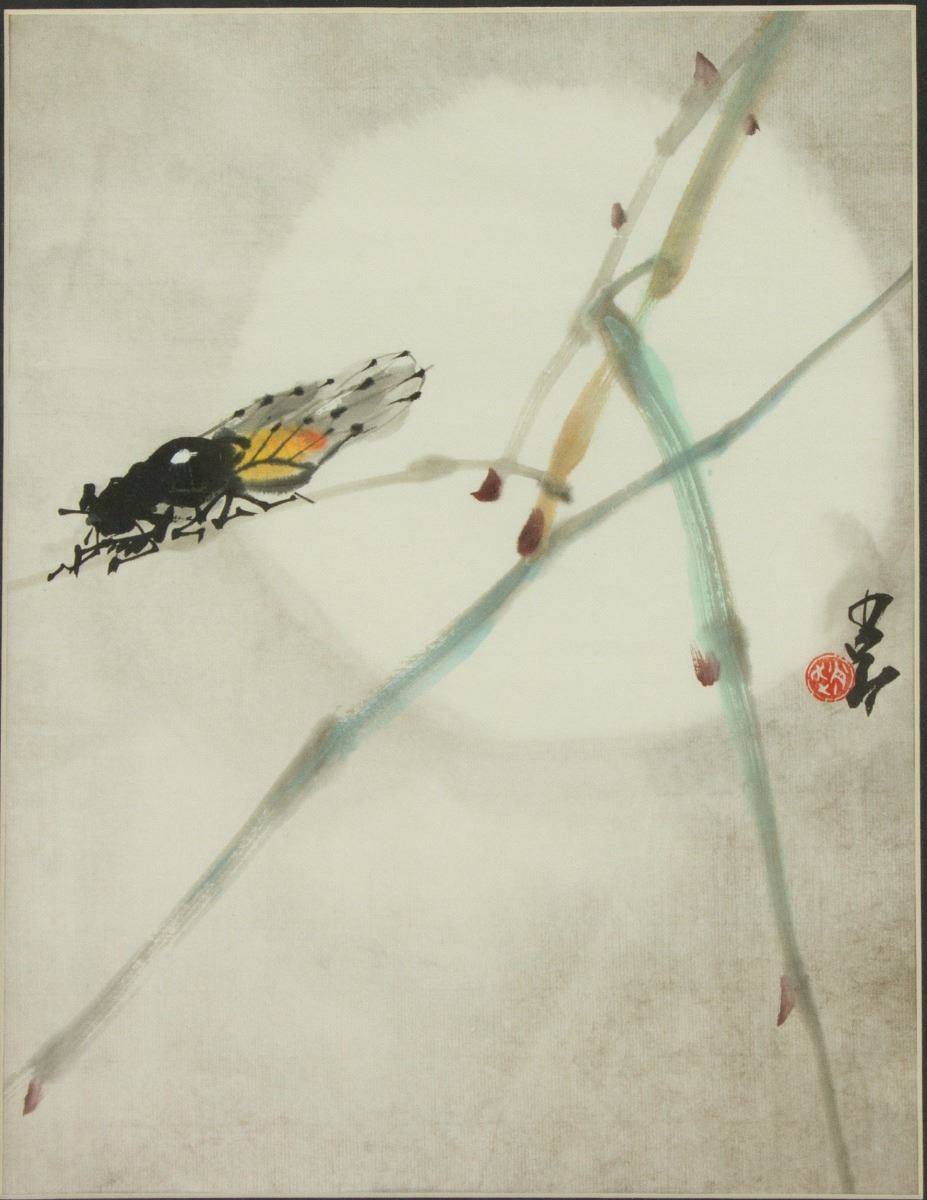 Cicada in the moonlight; Chinese ink and watercolour on paper; framed; signed Zhao Shaoang and inscribed with one artist seal; 35.5 cm × 27 cm