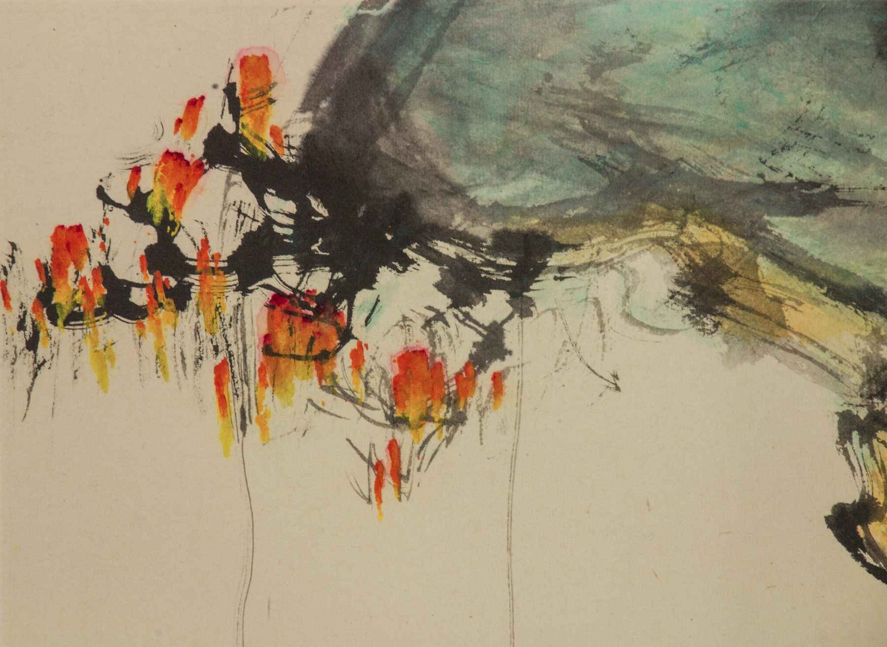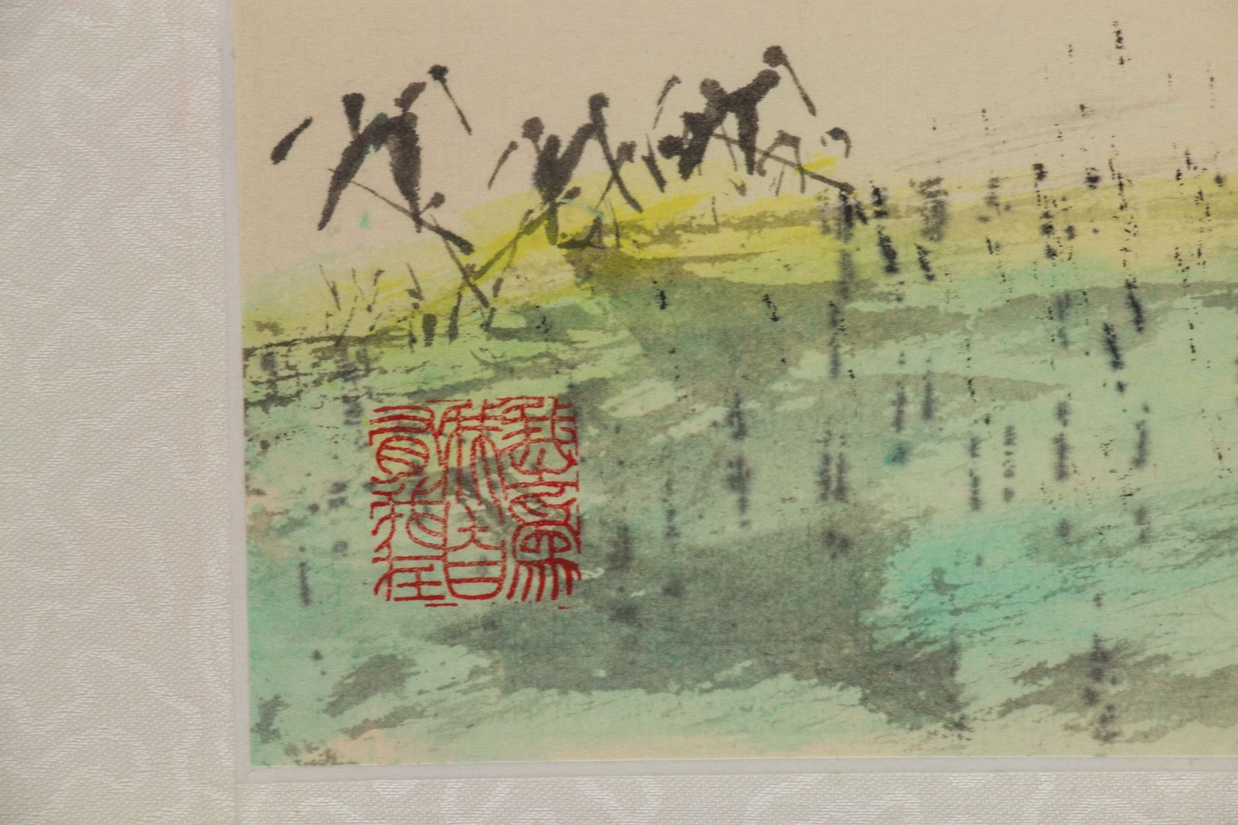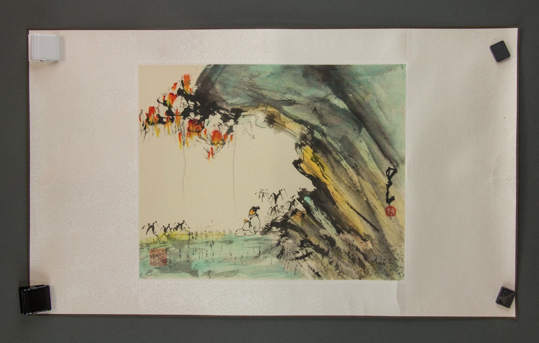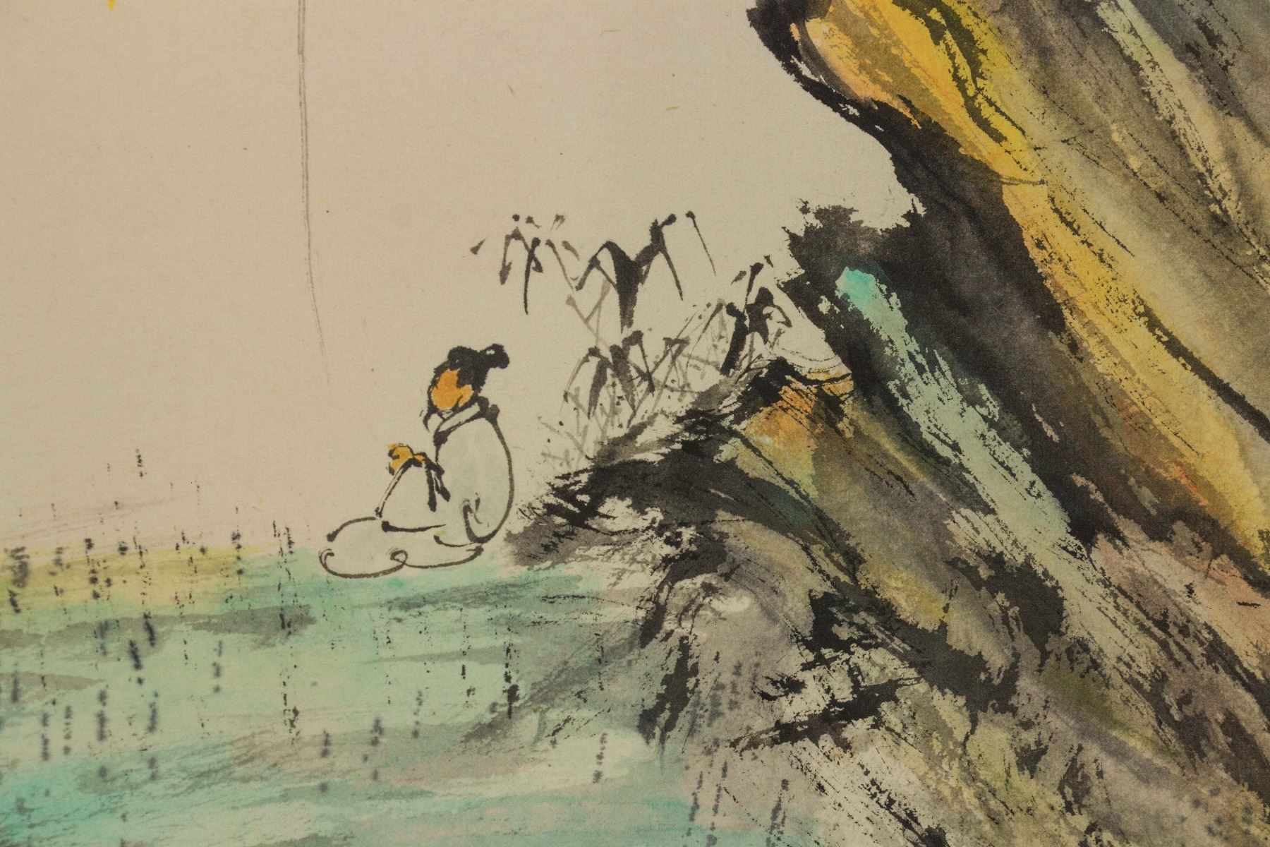 Mountainous landscape with hermit; Chinese ink and watercolour on paper roll; signed Zhao Shaoang (1905-1998); inscribed with 2 artist seals; 29.5 cm x 37 cm