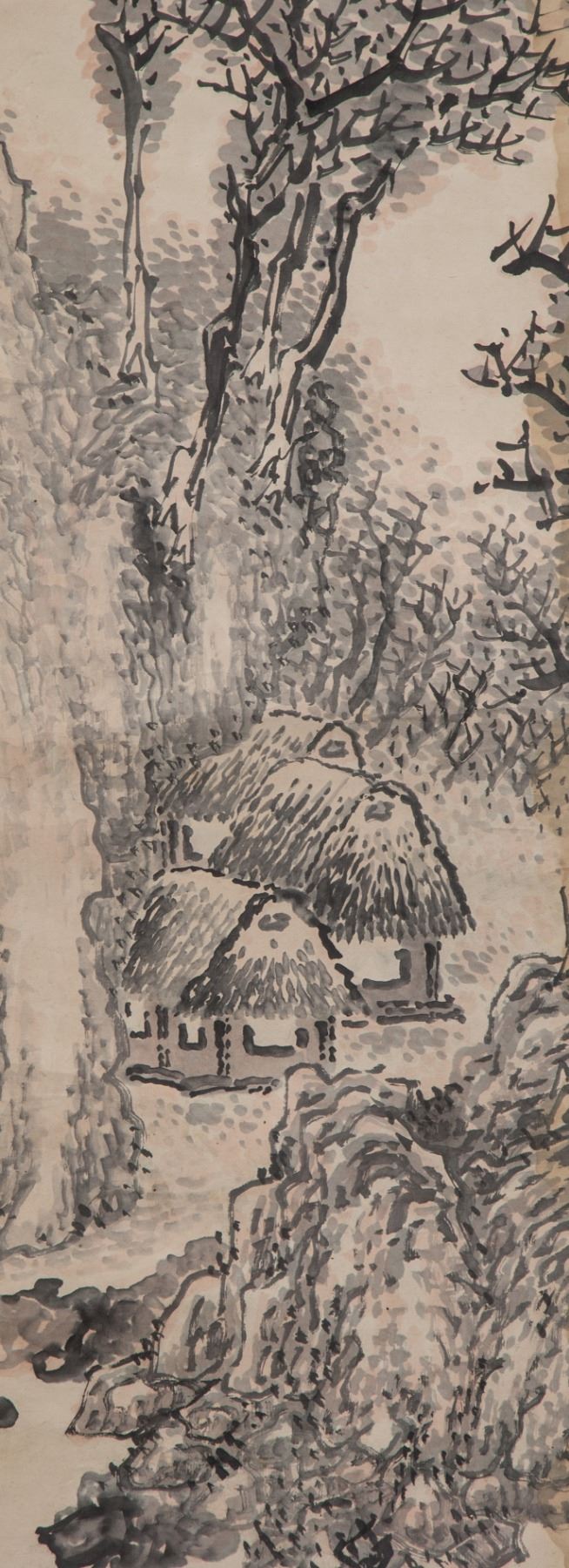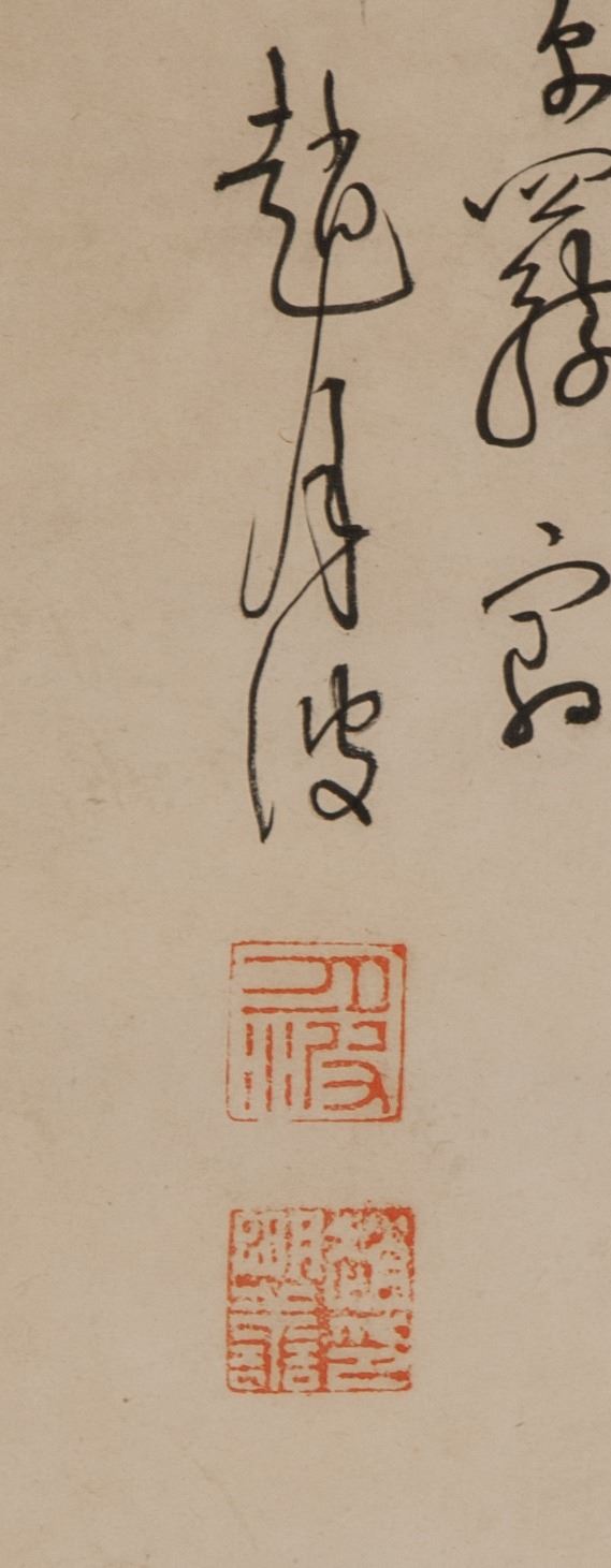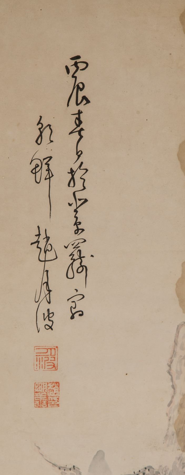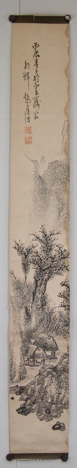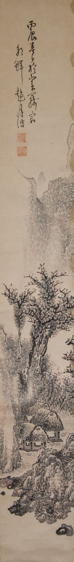 Ink on paper. Featuring painting of mountainous landscape. Signed Zhao Yuebao, inscribed with 2 artist seals. 19th century, Chinese. 123 x 18 cm.
