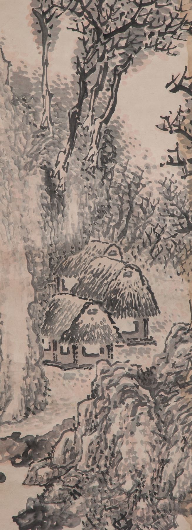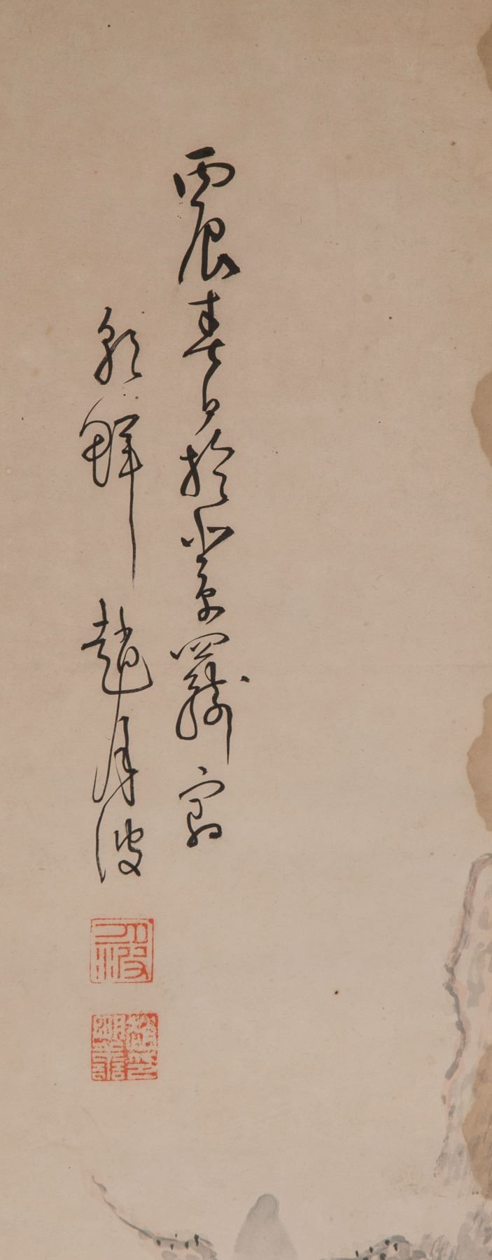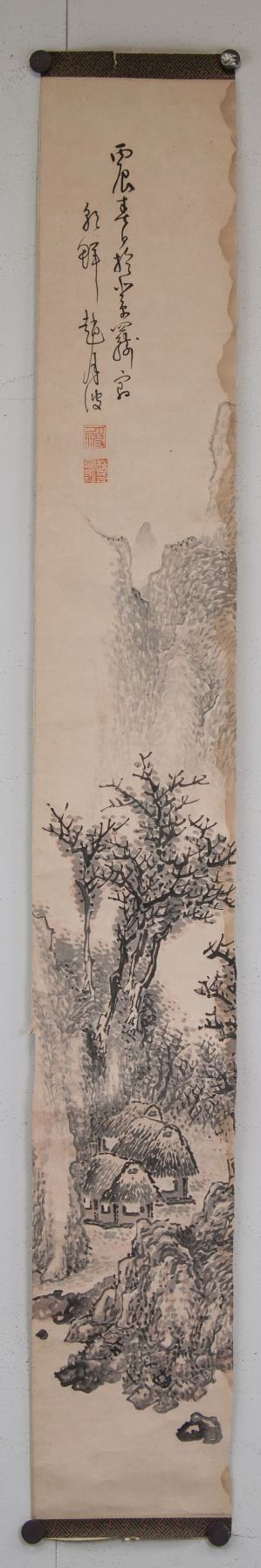 Painting of mountainous landscape; Chinese ink on paper; signed Zhao Yuebao; inscribed with 2 artist seals; 19th century; 123 cm x 18 cm