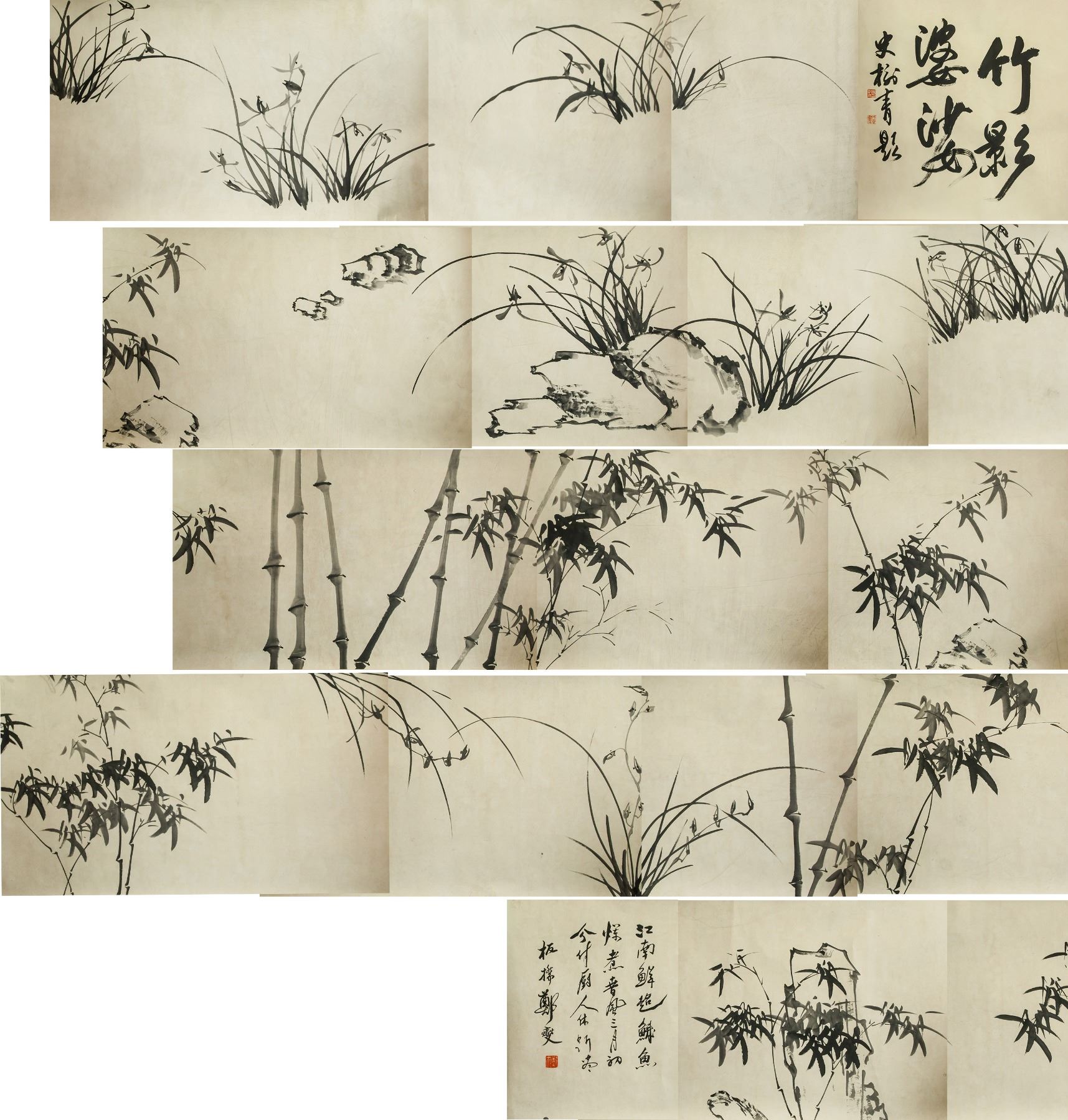 Ink on paper, long hand scroll. Featuring bamboo forest. Signed Zheng Banqiao 1693-1765 Chinese, inscribed with 1 artist seal. Title signed Shi Shuqing 1922-2007 Chinese, inscribed with 2 seals. 1110 x 50 cm.