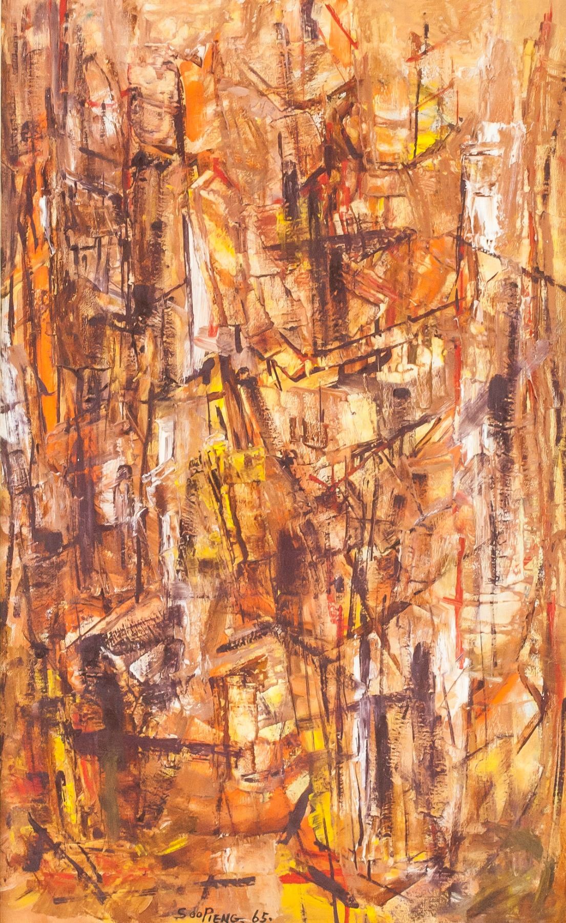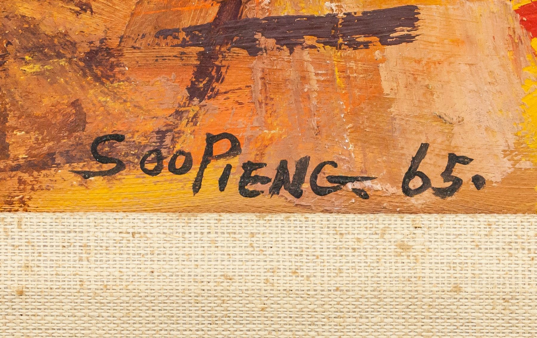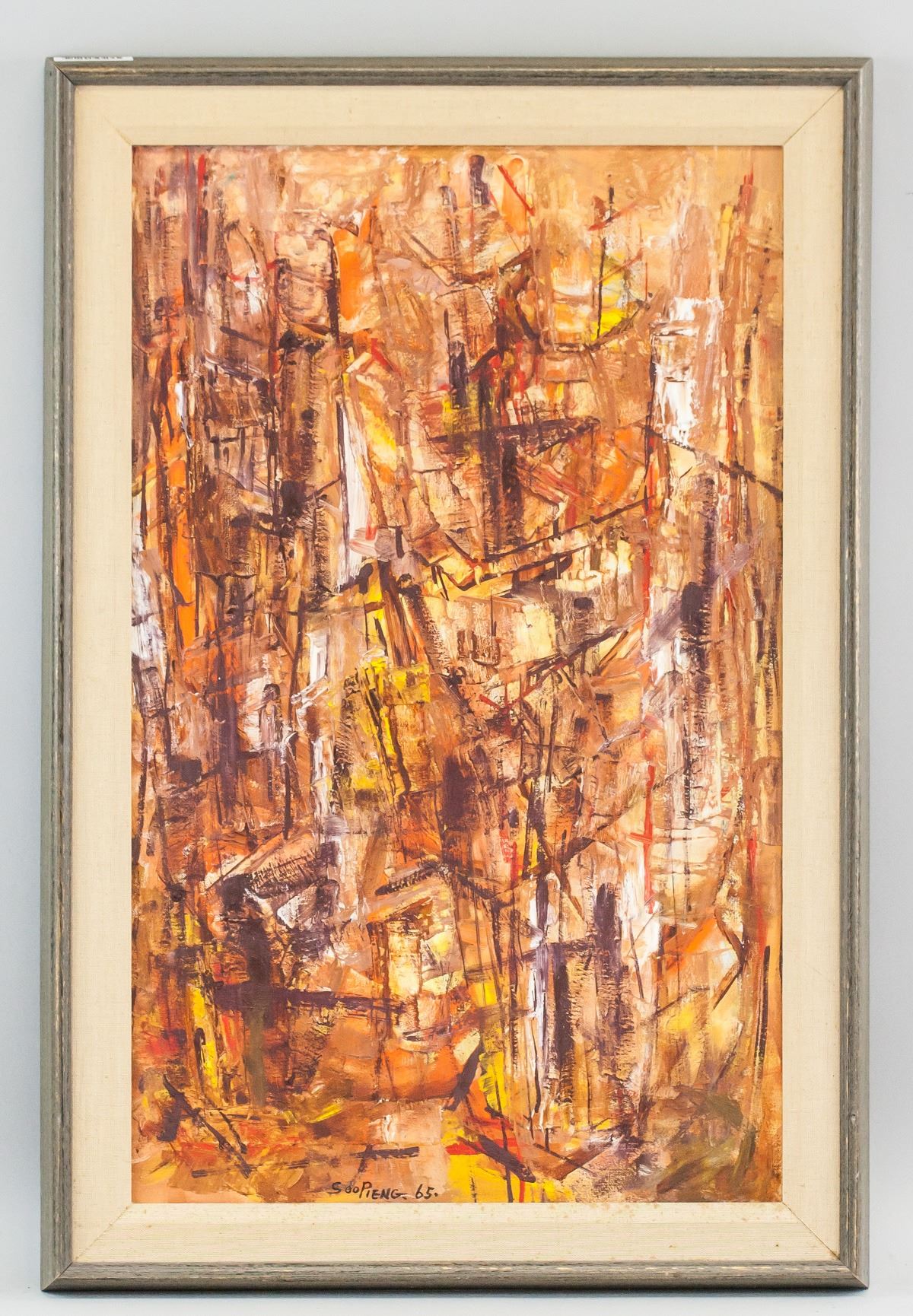 Oil on canvas, framed. Featuring an abstract expressionist composition. Signed Soo Pieng and inscribed 65 beside signature on the lower edge. Attributed to Zhong Sibin (1917-1983, Chinese). Canvas: 62 x 38 cm (24 x 15.5 inches). Frame: 70 x 47 cm (27.5 x 18.5 inches). Provenance: This lot carries limited provenance from a Southern Ontario estate