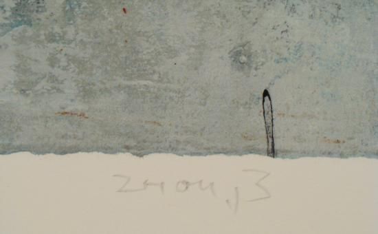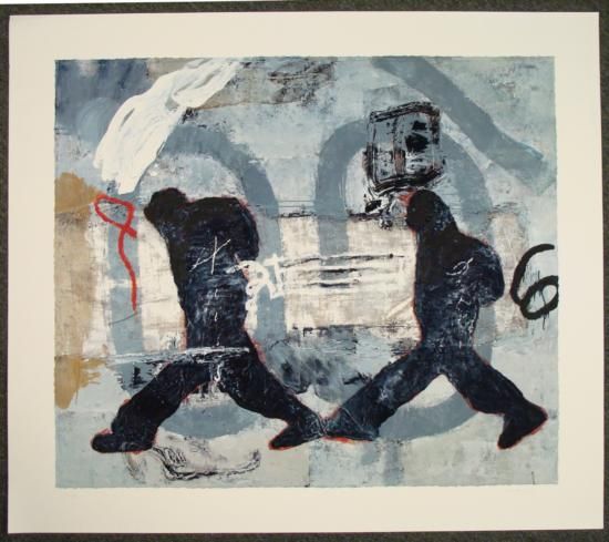 This is a Giclée Art Print by the Zhou Brothers. The two figures are travelers in Europe, perhaps walking down a street, or catching a train. The abstract background, with hand embellished black and red squiggles, allow an imagined interpretation of the European setting. Artist(s): The Zhou Brothers Signature: Signed "Zhou B" in pencil, lower right Edition: Numbered 3/99, in pencil, lower left Title: "Travel Europe" Medium: Giclée on paper, with hand embellishments Image size: 29 x 33 3/4 inches Sheet size: 35 x 40 inches Condition: Excellent This piece can inspire the abstract excitement of European travel. Artist Biography:The Zhou Brothers, Shan Zuo and DaHuang Zhou, were born in 1952 and 1957 in China. They studied art as well as drama, and both received MFAs from the National Academy for Arts and Crafts in Beijing. Their style developed into one of collaboration, comprising painting, performance, and sculpture. Their aesthetic is based on a combination of Eastern and Western philosophy. Their work became widely recognized, and they won the National Prize of Chinese Avant-Garde of the Ministry of Culture, and the Prize for Creativity from the United Nations Peace Corps. Seeking an environment in which to expand their art, they left the political confines of China for the U.S., where they settled in Chicago, where they are now based. Their work can be found in private and public collections around the world, including, in Shanghai, China, the National Gallery and the International Cultural Palace, and in Chicago at the United Airlines offices, and Encyclopedia Britannica. The brothers also established their Zhou B. Center in Chicago as a large gallery space to exhibit an eclectic variety of visual artists.