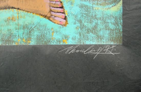 This colorful and interesting print by well-known Yunnan School artist Zhou Ling is entitled "A Girl in Violet" - Limited edition serigraph on rice paperSigned and numbered from an edition of 300Image size 33 × 33 inchesExcellent condition; never framed. Small spots of adhesive residue on corners, a remnant of storage mounting, will easily mat out in framing.Certificate of AuthenticityRetail gallery price USD 2400Zhou Ling has been influenced by ancient frescoes, painted pottery, and sculptures. A particular specialty of the talented artist is images of beautiful and powerful woman. A wonderful blend of East and West, enhanced by a lively palette and inspired composition, this signed and numbered limited edition print will be a welcome addition to any collection or décor. Offered here at an opening bid far below the retail gallery price. * * SPECIAL SHIPPING NOTE: This print will be shipped rolled in a heavy duty mailing tube.