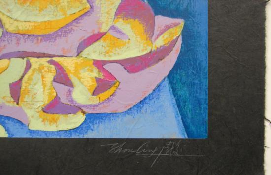 This gorgeous print - so vibrant and mysterious - is by the well-known and very popular Yunnan School artist Zhou Ling: Title: "Spirit of the Butterflies"Limited edition serigraph on black rice paperSigned and numbered in Roman numerals from an edition of 100Image size 25 × 37 inchesExcellent condition; never framed. Small spots of adhesive residue on corners, a remnant of storage mounting, will easily mat out in framing.Certificate of AuthenticityRetail gallery price USD 2400This very representative print - offered here for an opening bid far below the retail gallery price - will be a treasured addition to any collection or décor!