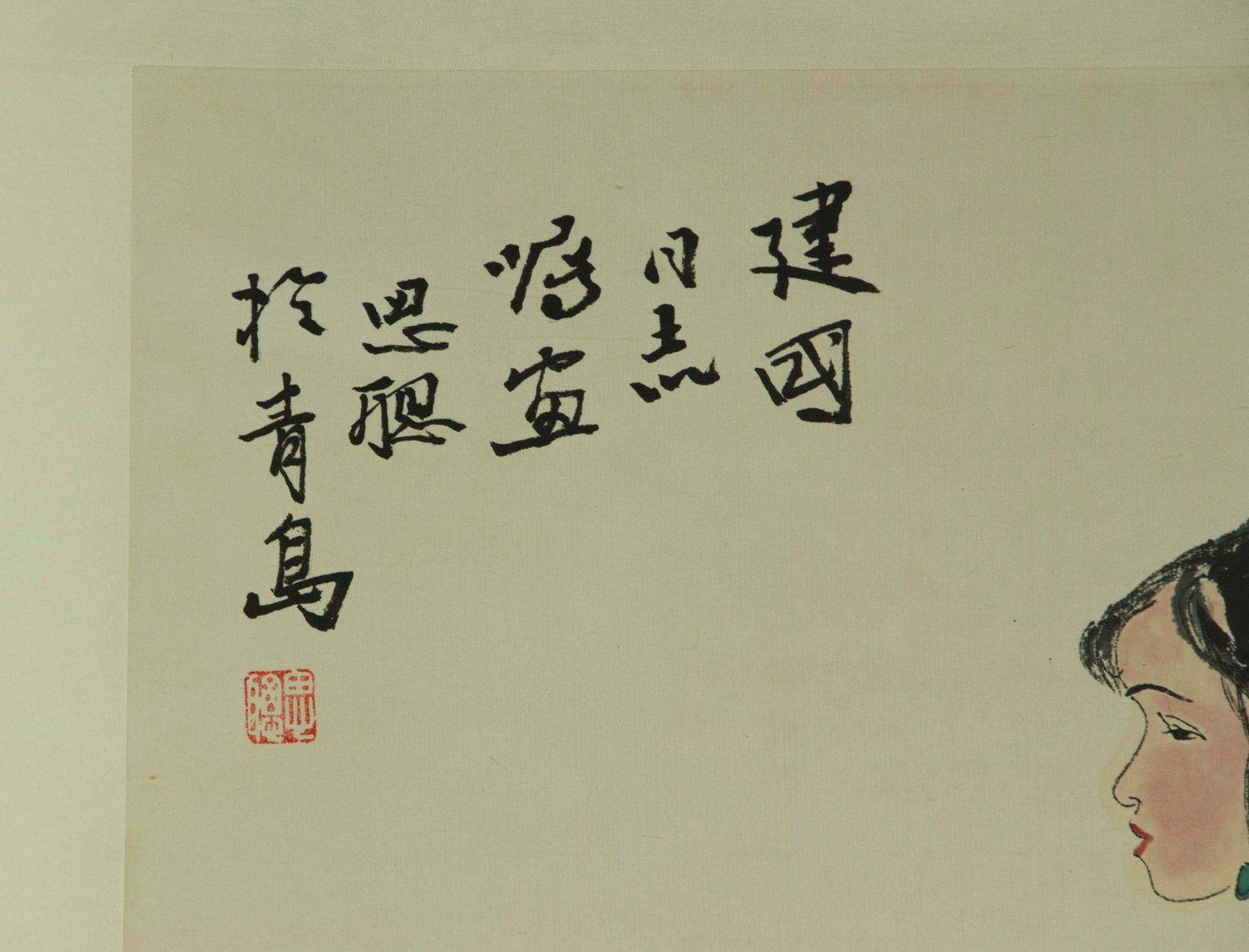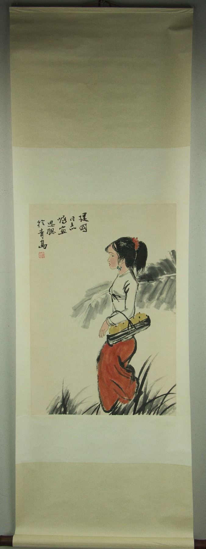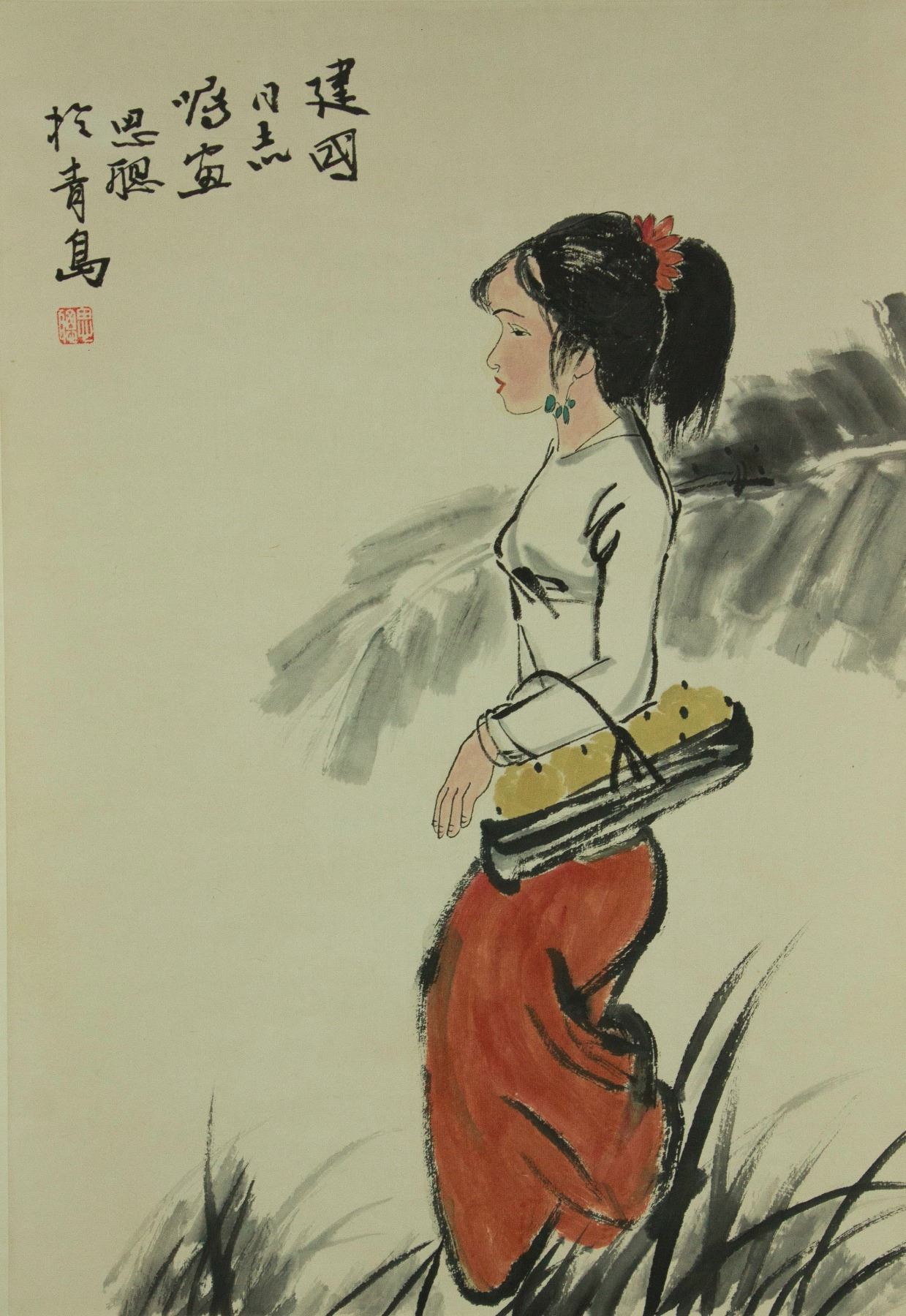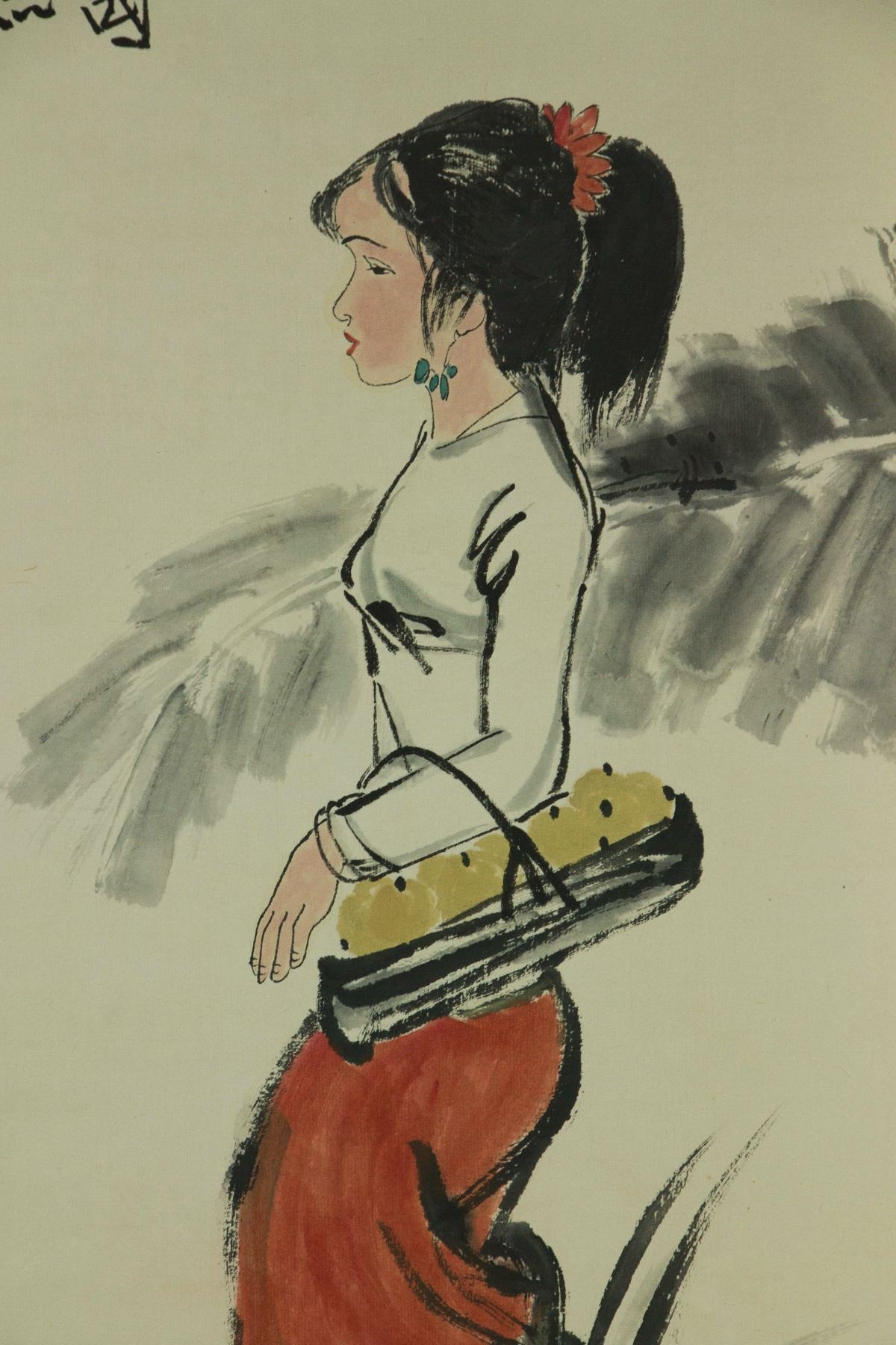 Girl holding a basket of fruits; Chinese ink and watercolour on paper; hanging scroll; signed Zhou Sicong and inscribed with one artist seal; 163 cm × 62 cm