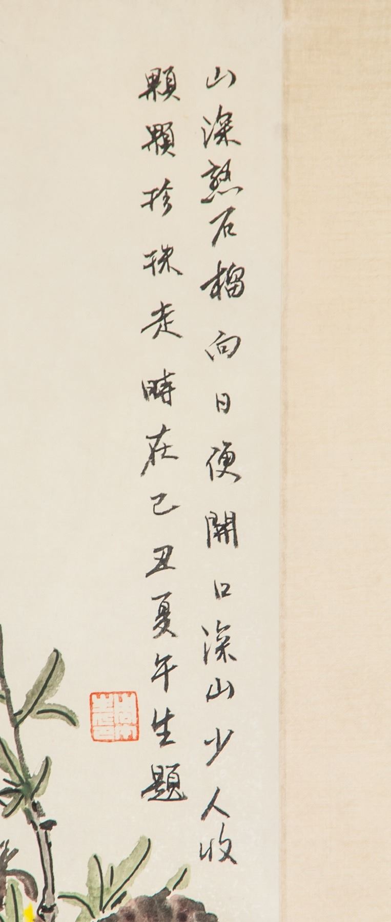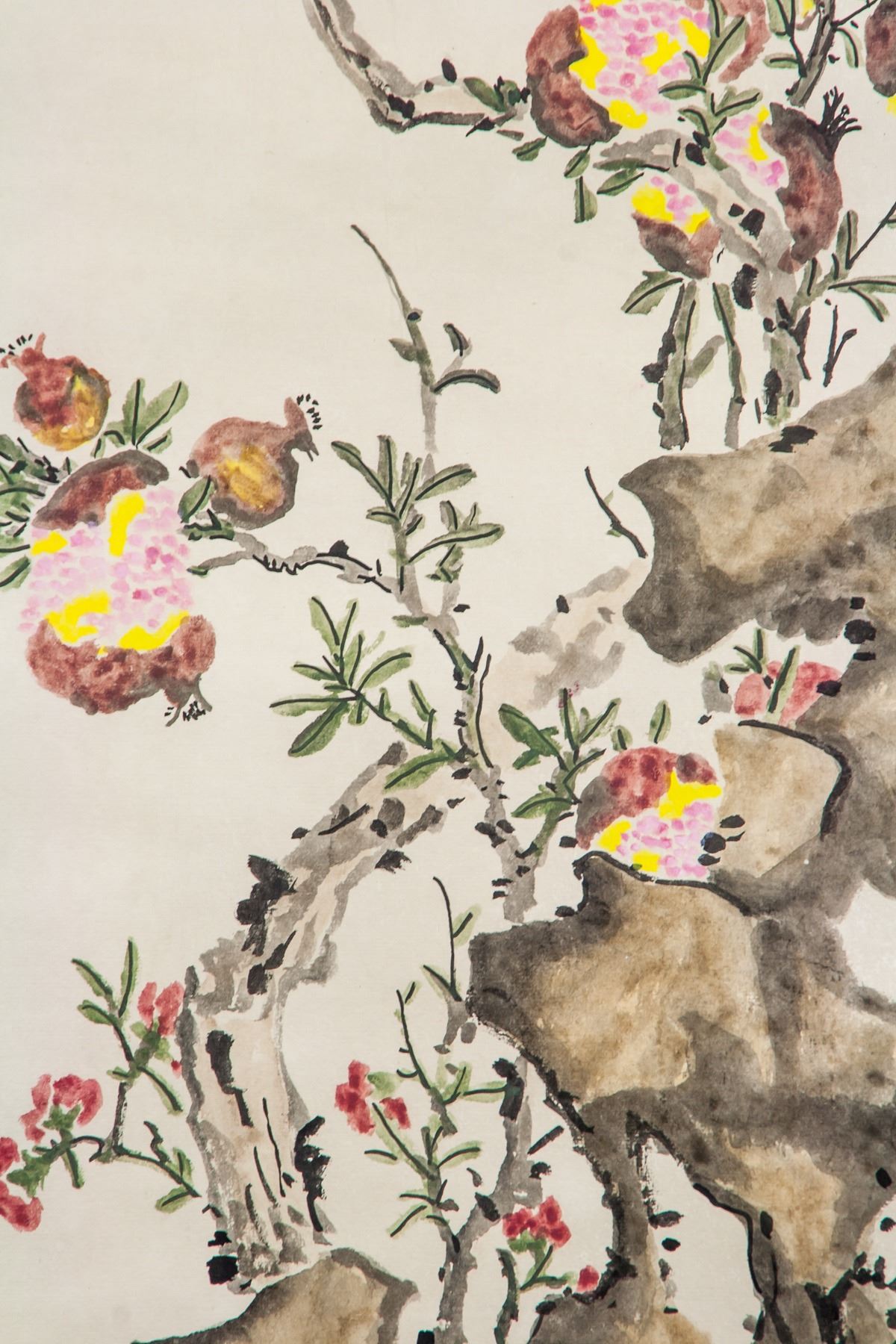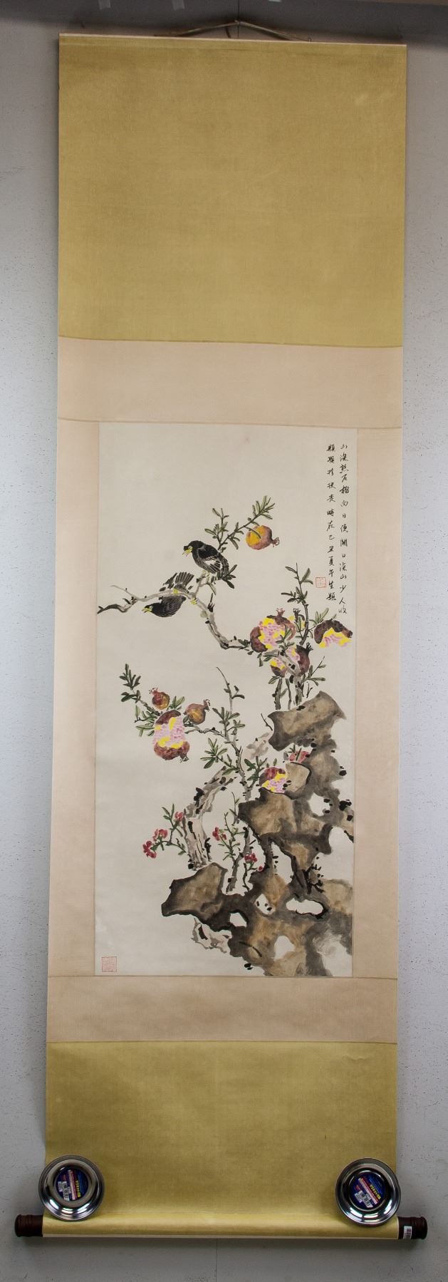 Watercolor and ink on paper, hanging scroll, featuring birds and pomegranate, signed Zhou Wusheng (Chinese, 20th century), inscribed with 2 artist seals, 91 x 42 cm. Zhou Wusheng is a Chinese visual artist. Several works by the artist have been sold at auction, including 'MADARIN DUCKS' sold at Poly International Auction Co. 'Contemporary Chinese Ink Paintings II' in 2014 for $73,626.