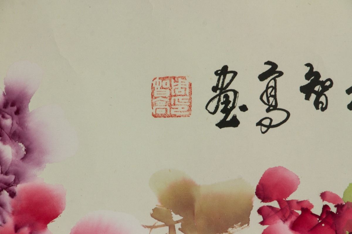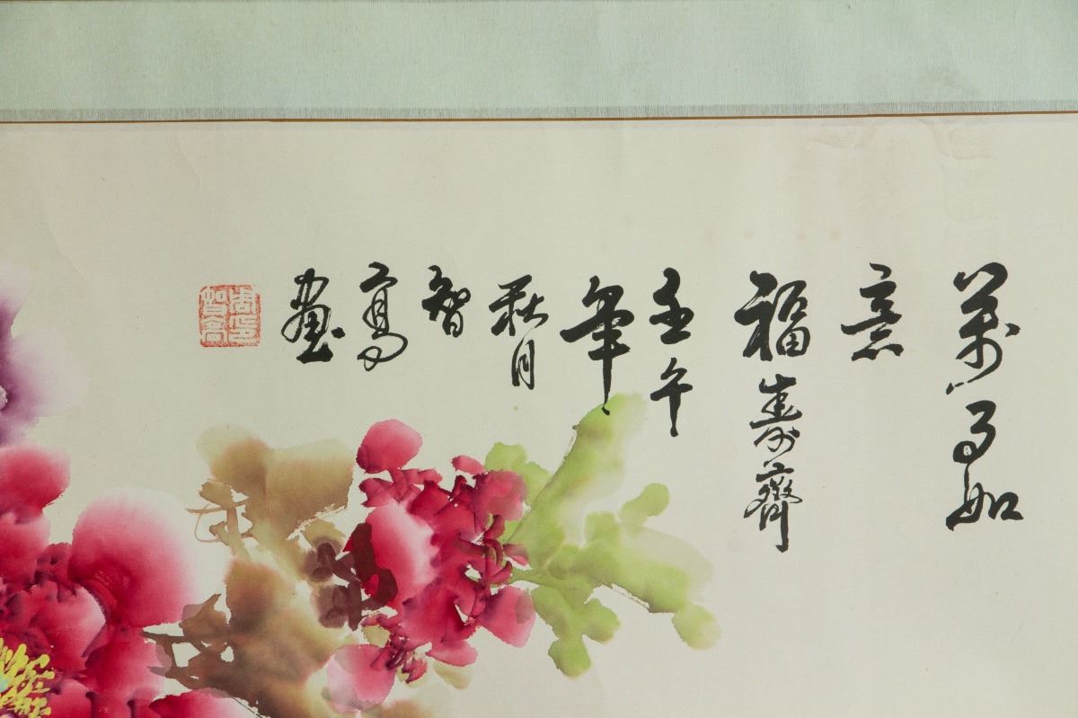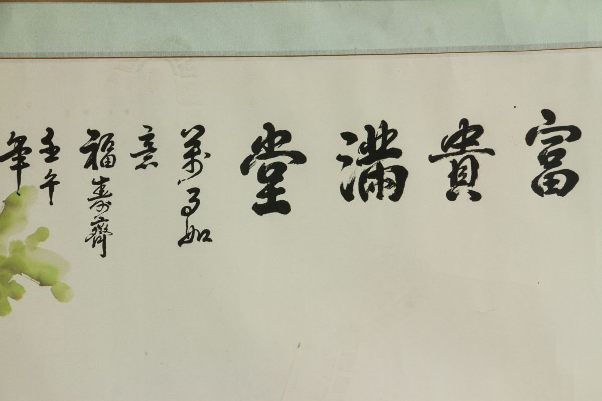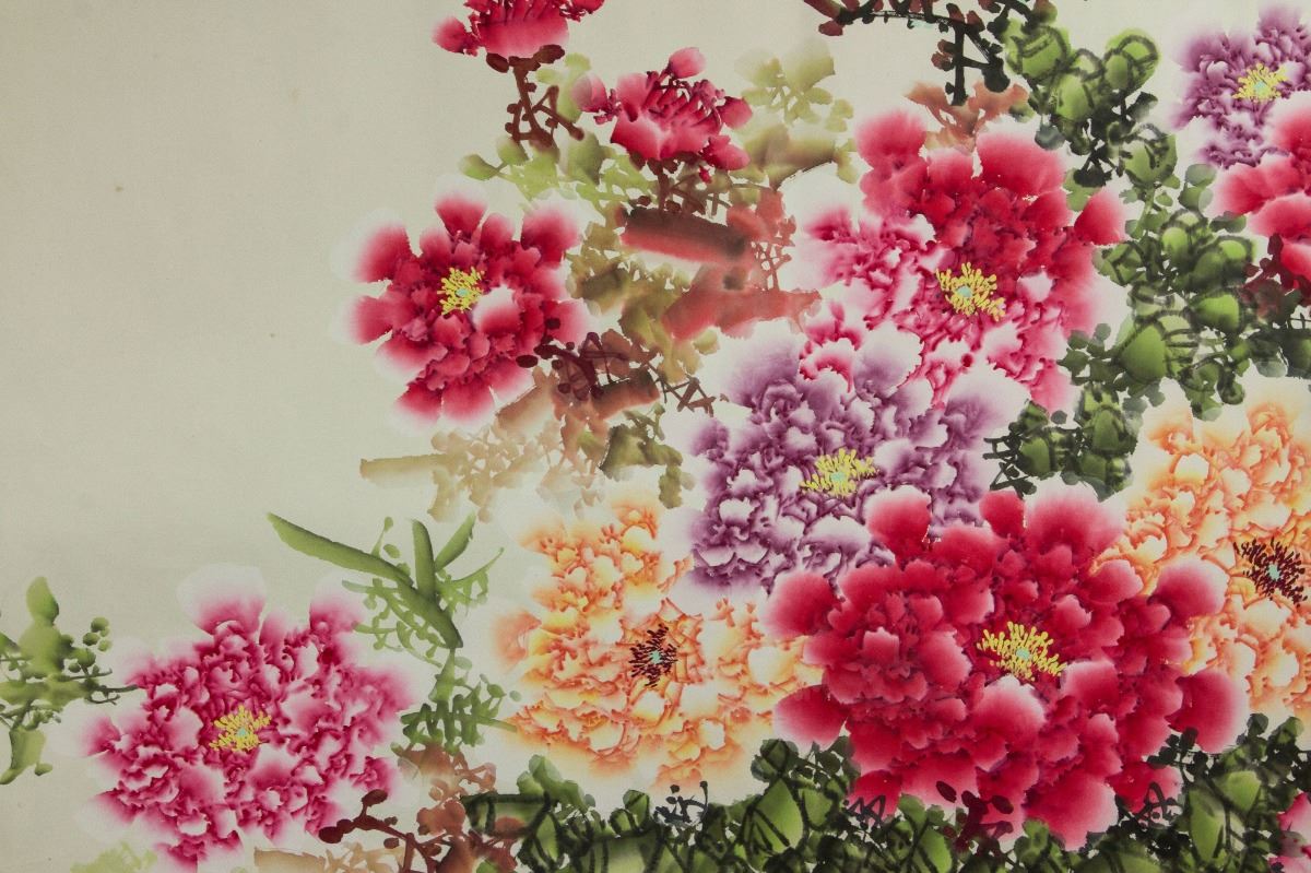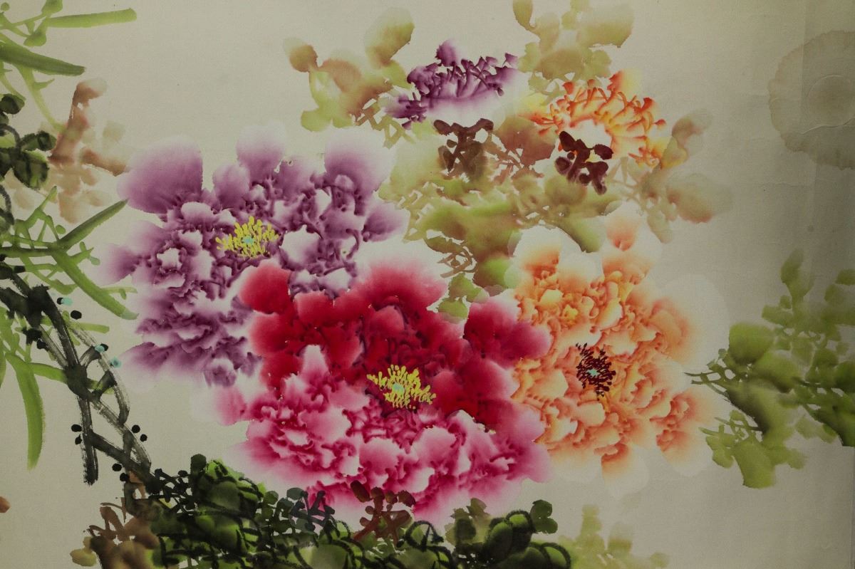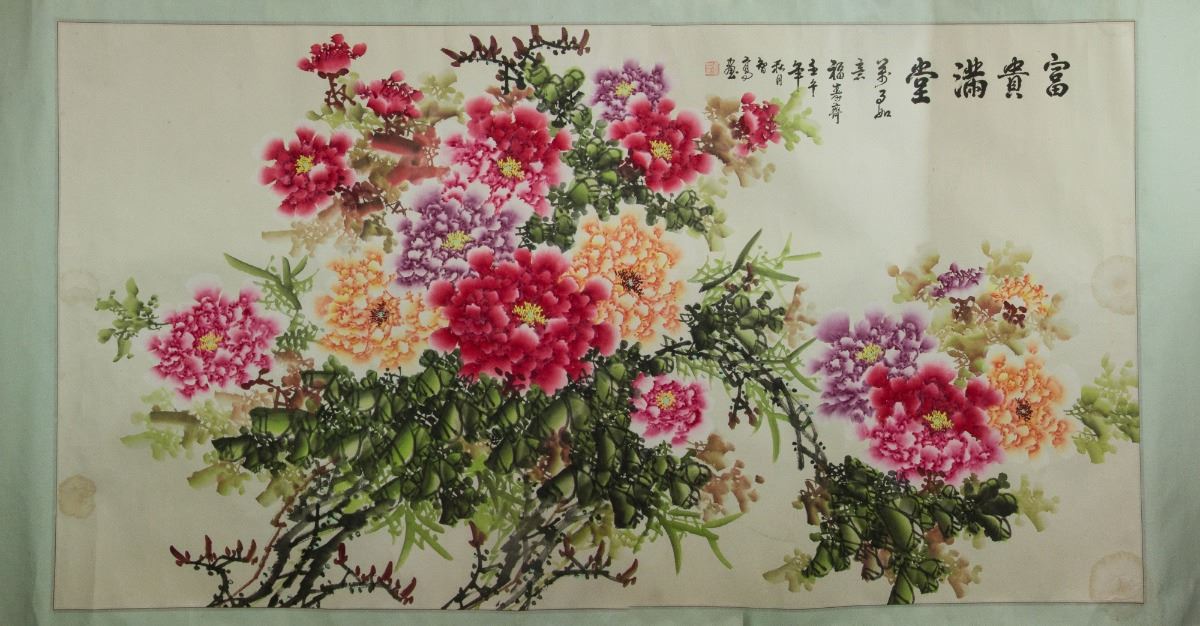 A group of peony flowers, with Chinese characters "fu gui man tang" meaning the home is full of prosperity; Chinese ink and watercolour on paper; hanging scroll; signed Zhou Zhigao (b.1945); inscribed with 1 artist seal; 117 cm × 219 cm