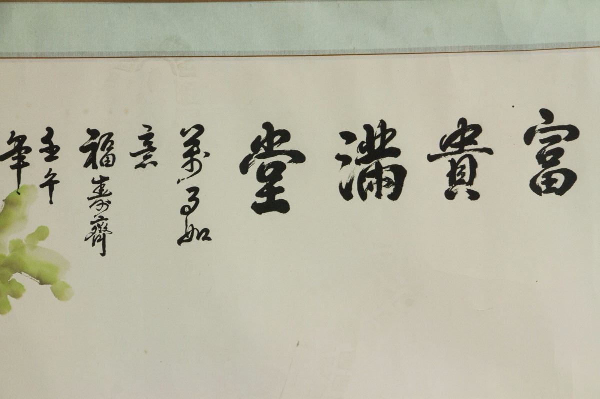 >A group of peony flowers, with Chinese characters "fu gui man tang" meaning the home is full of prosperity; Chinese ink and watercolour on paper; hanging scroll; signed Zhou Zhigao (b.1945); inscribed with 1 artist seal; 117 cm × 219 cm