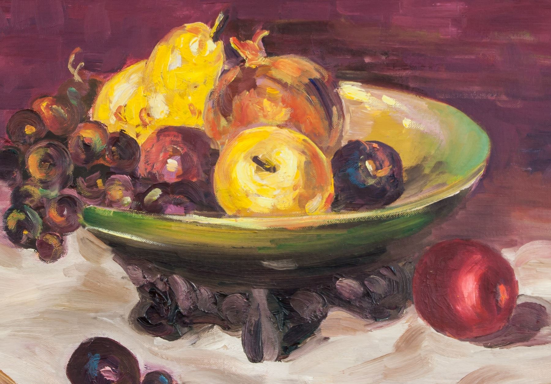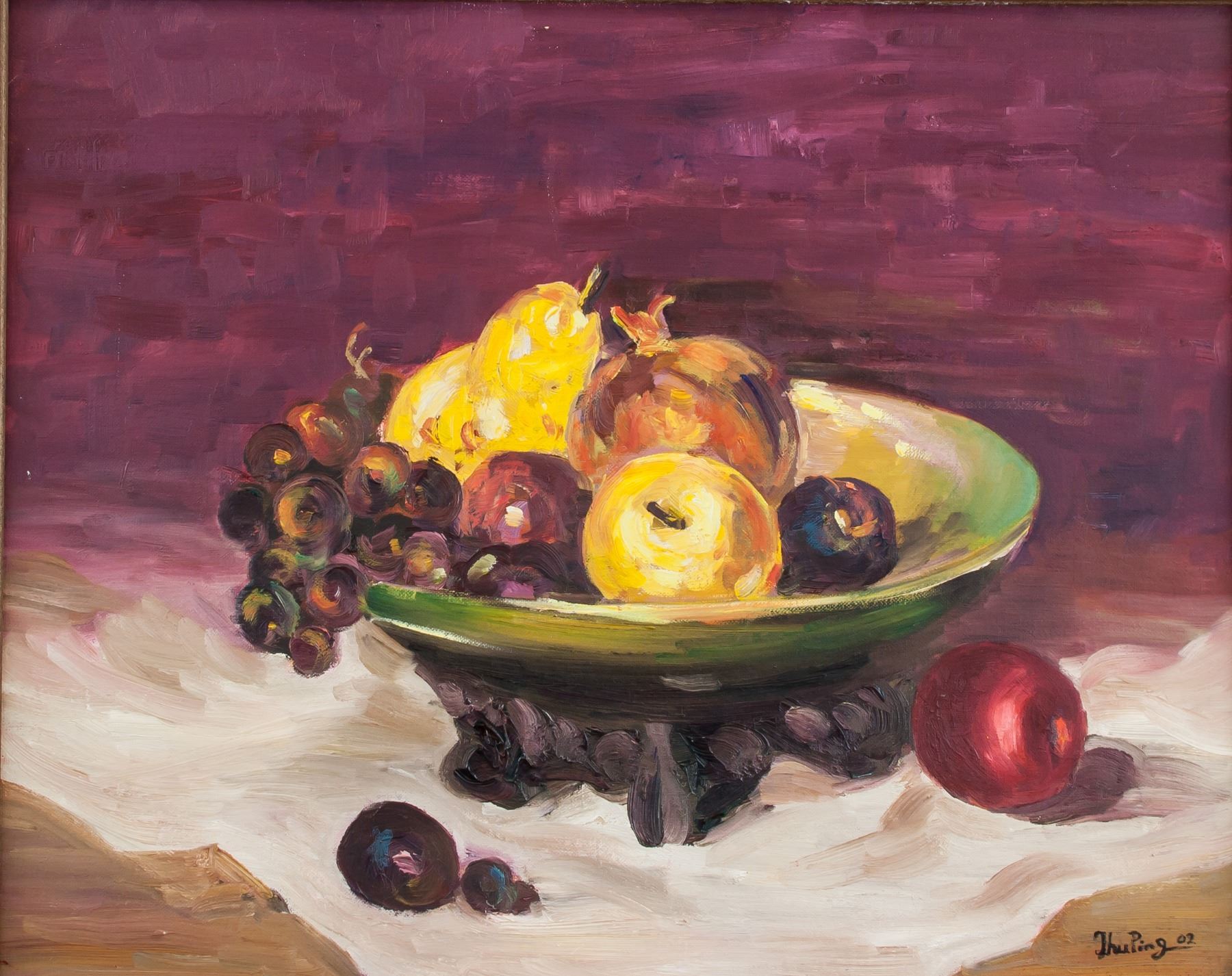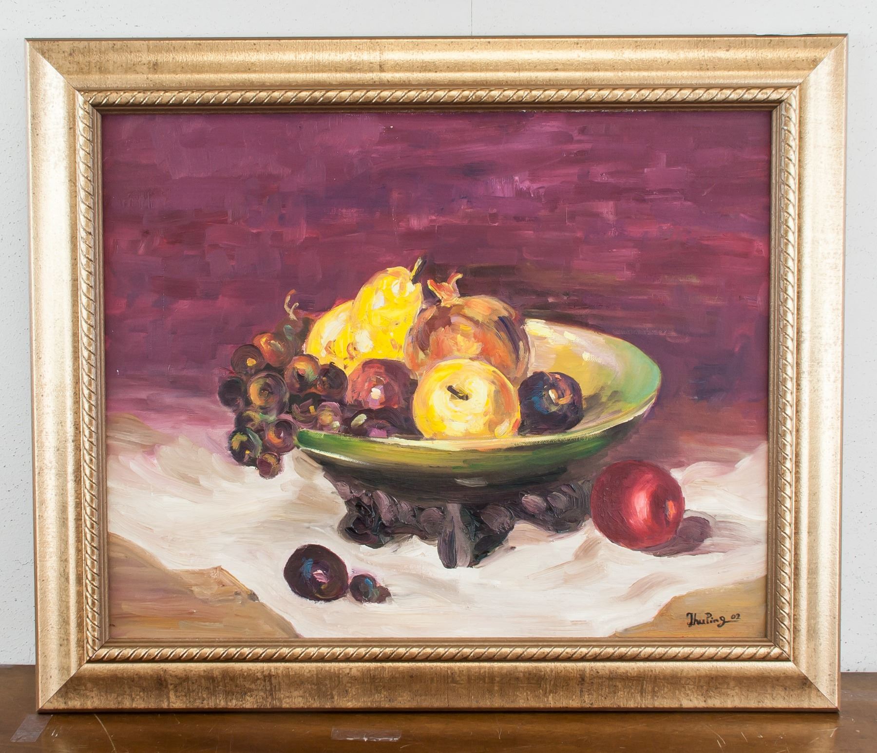 Still life painting of fruits; oil on canvas; framed; lower right corner signed Zhu ping (b.1943), American Chinese painter and scholar; with artist biography on back; date 2002; 15.5 inch x 19.5 inch