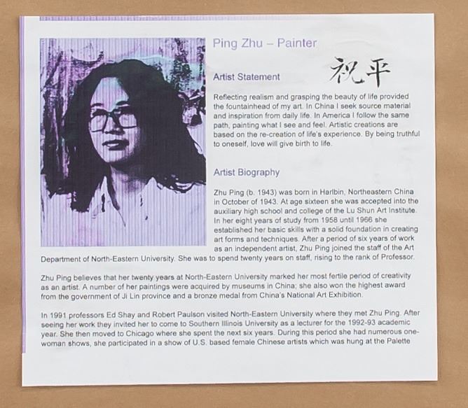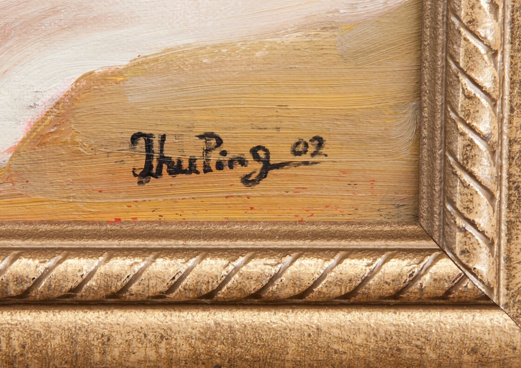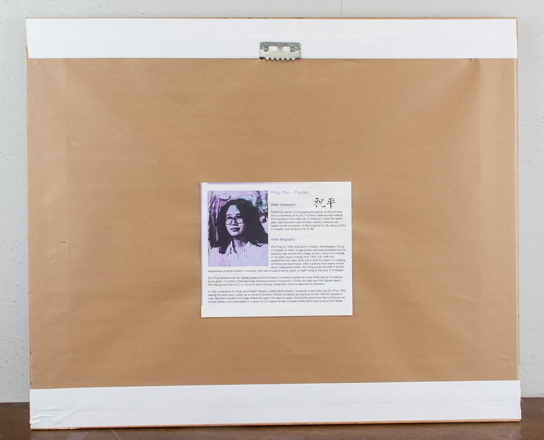 Still life painting of fruits; oil on canvas; framed; lower right corner signed Zhu ping (b.1943), American Chinese painter and scholar; with artist biography on back; date 2002; 15.5 inch x 19.5 inch