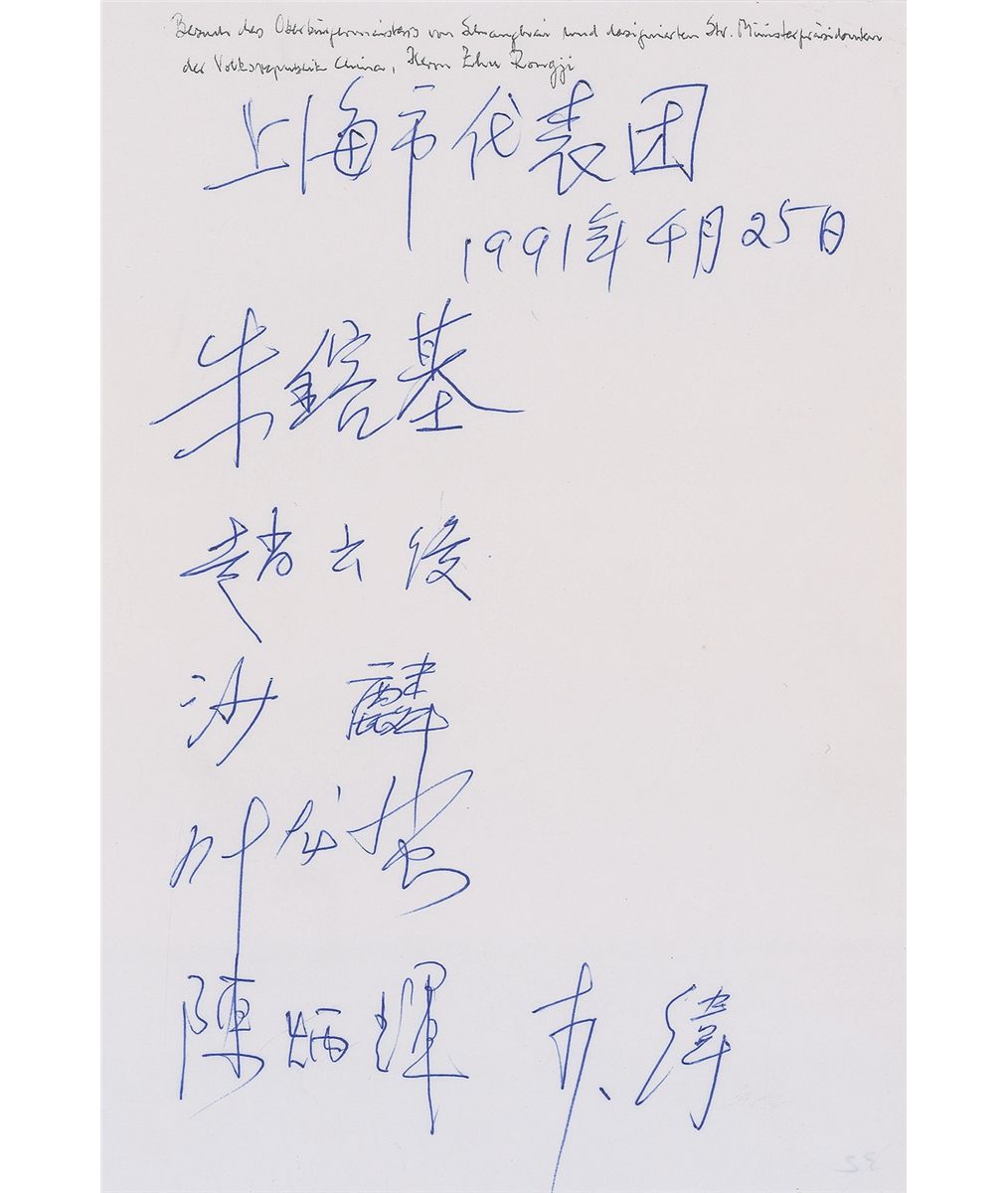Chinese political leader (born 1928) who served as the fifth premier of the People’s Republic of China from 1998 to 2003; he also acted as mayor of Shanghai from 1987 to 1991. Nice ballpoint signature in Chinese on an off-white 6.5 x 9.75 sheet, which includes five additional unidentified signatures. In fine condition.