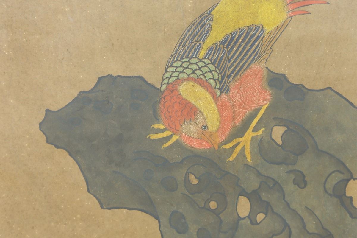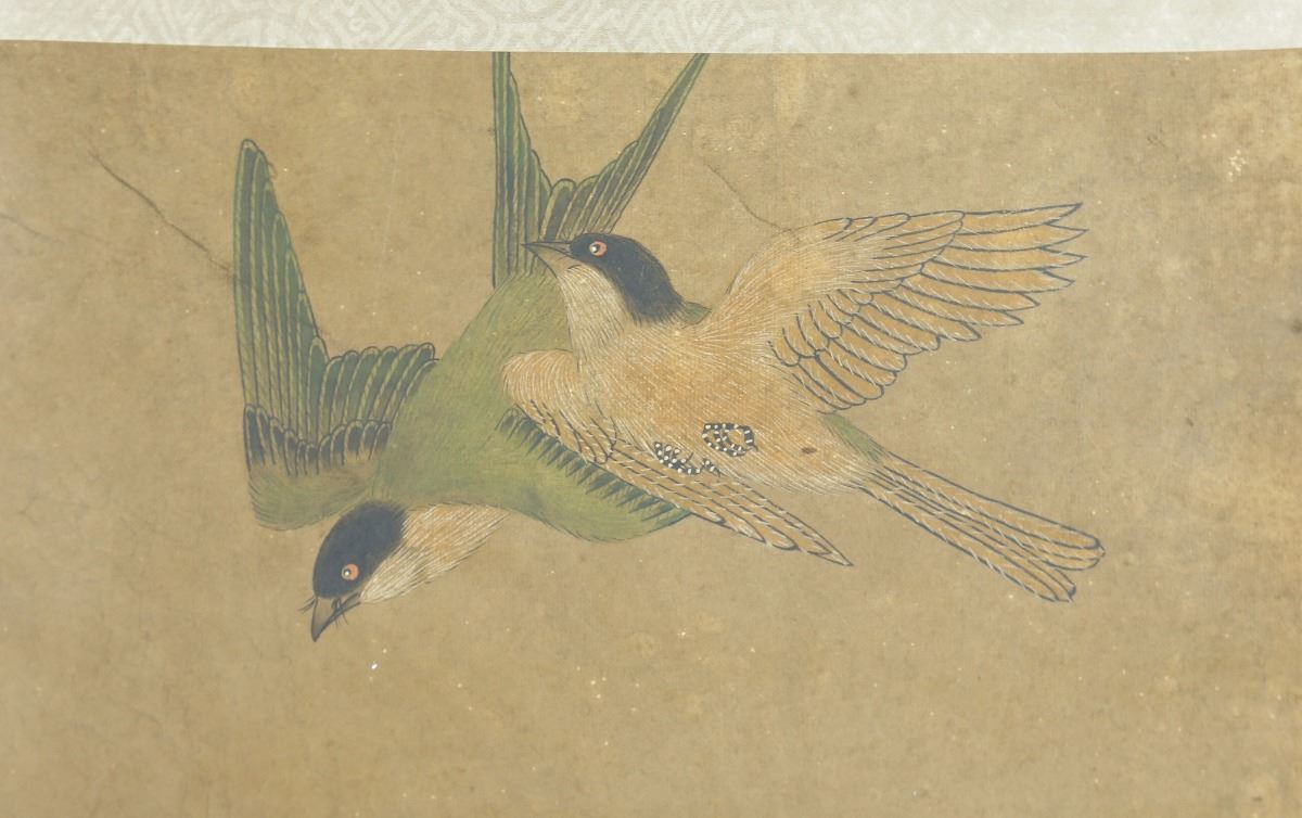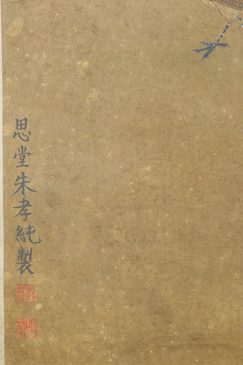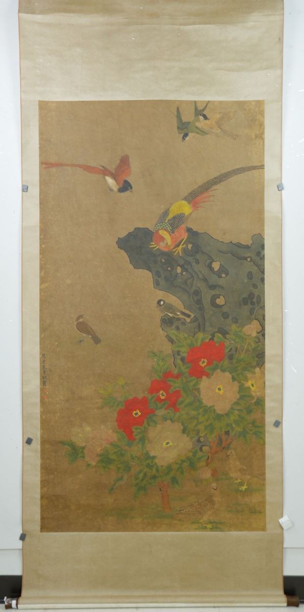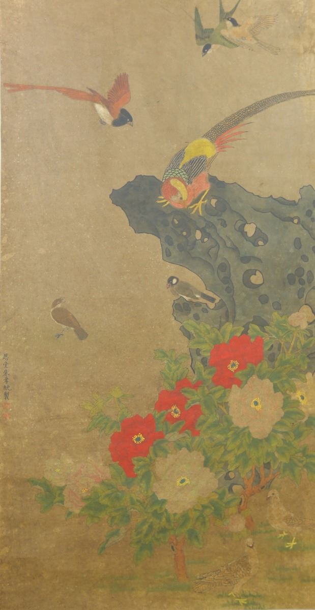 Songbirds and peonies, hanging scroll, Chinese ink and watercolour painting on paper, signed Zhu Xiaochun with two artist red seals. 154 cm x 86 cm. Provenance: T. Ng Collection Toronto.