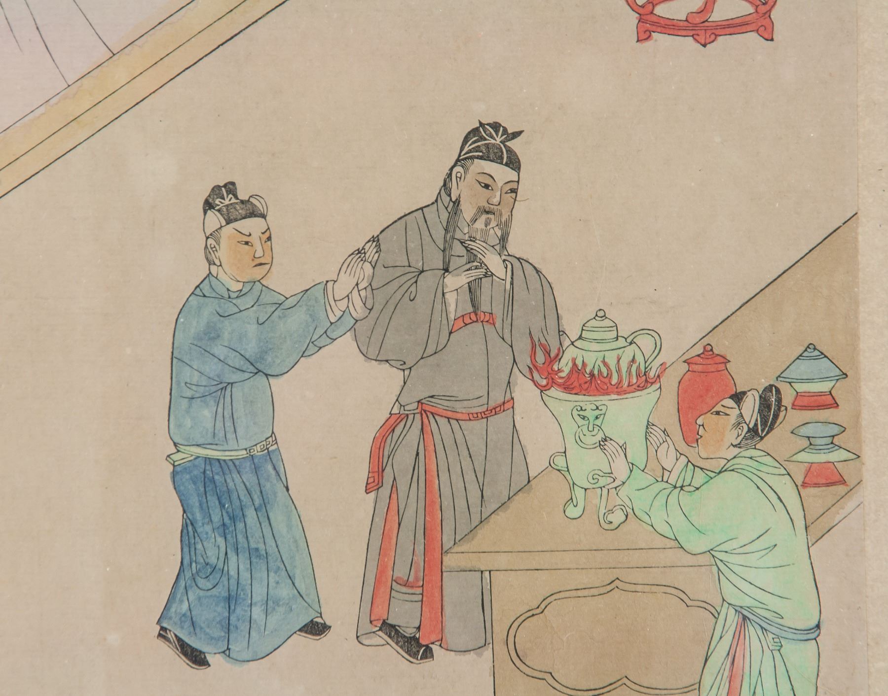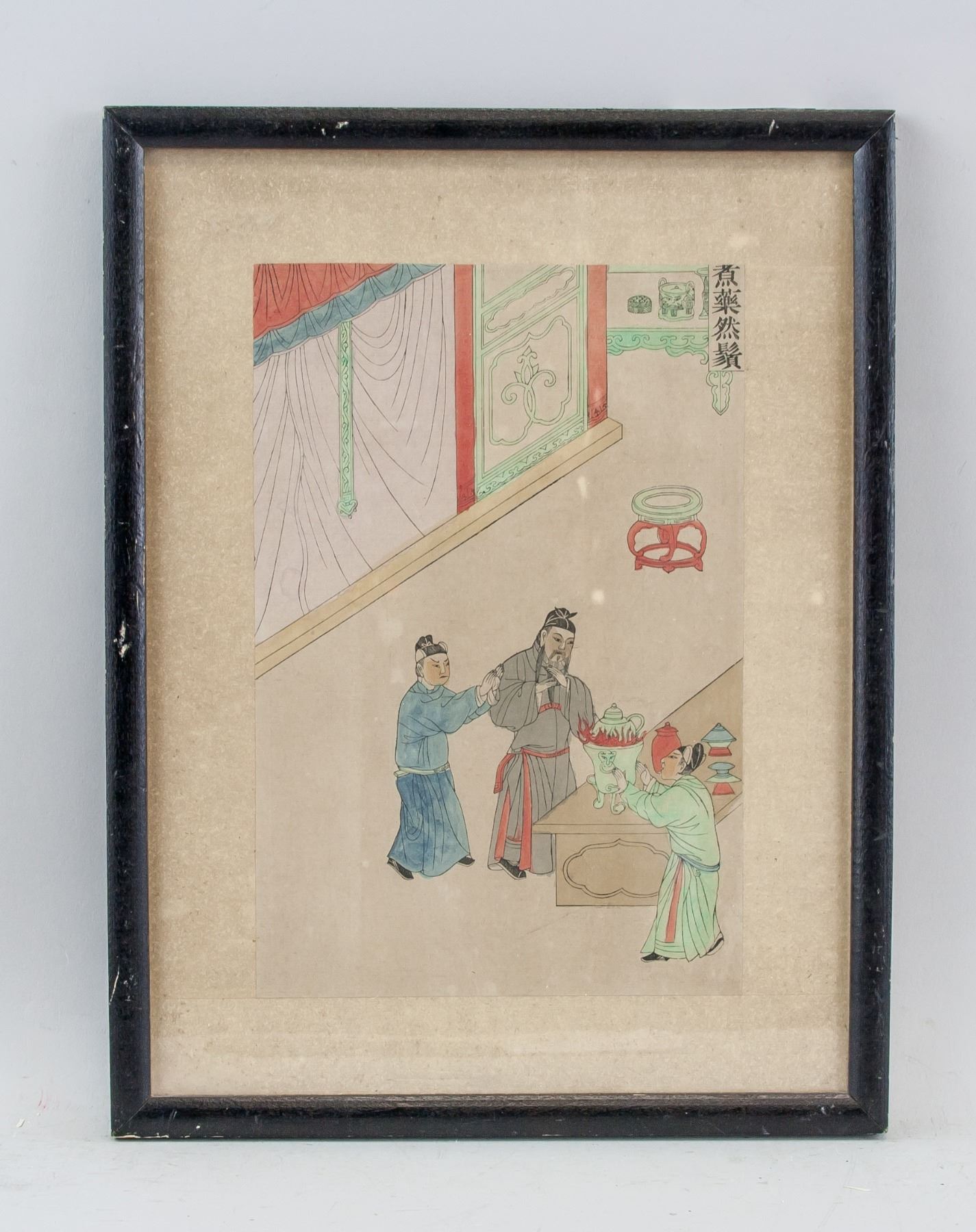 Watercolor and ink on paper, framed, featuring a man burning his beard to boil the medicine, with four letters Zhu Yao Ran Xu. 23 x 15.5 cm