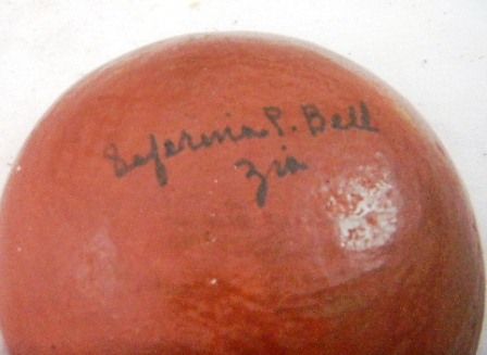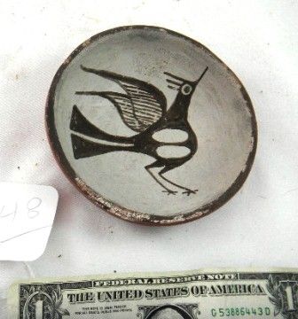 Zia Bird Bowl signed by Serferina P. Bell, approximately 1960 and measuring 4 x 1 inch. Shipping $15.00. Some paint scuffing on edge