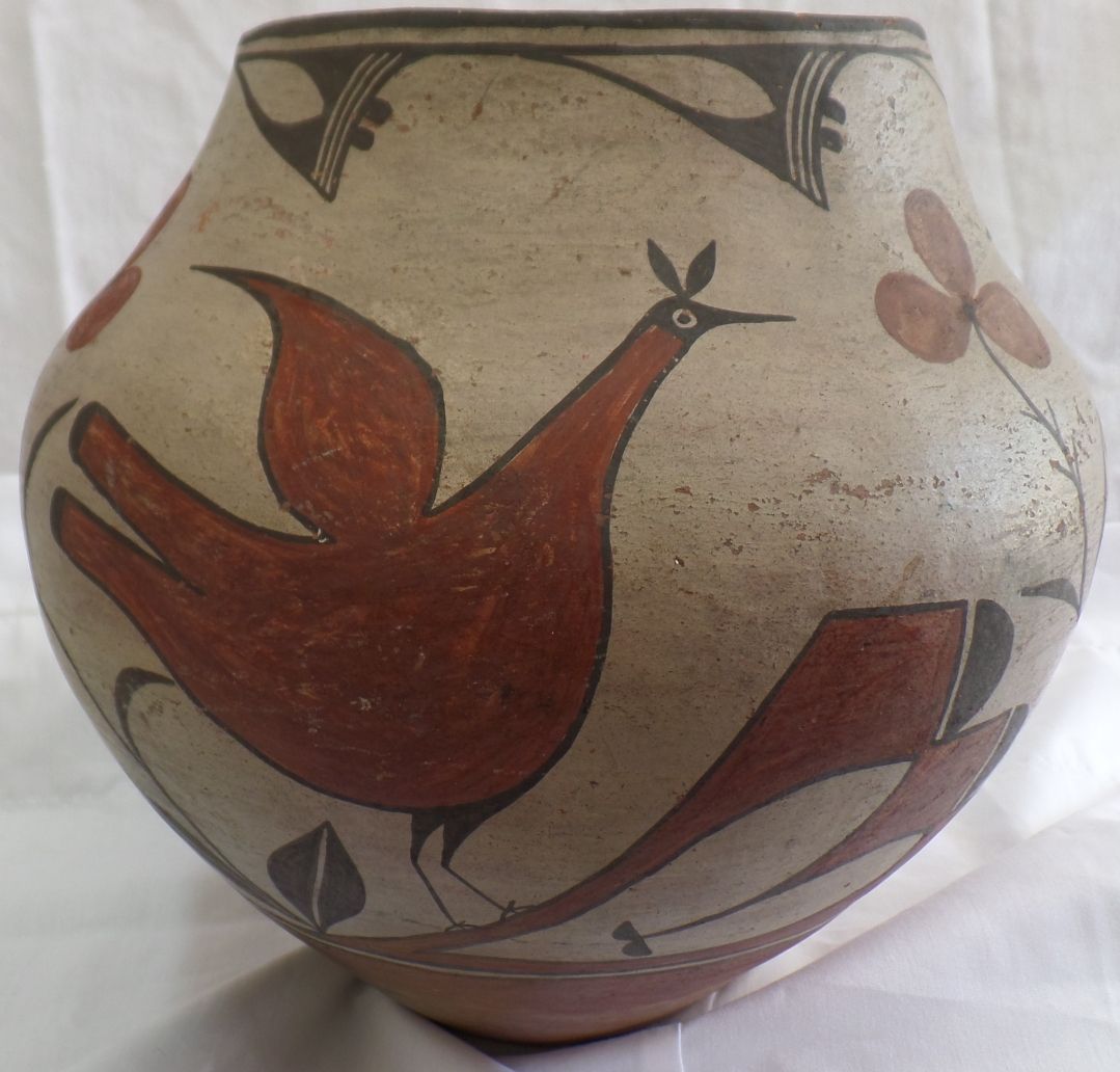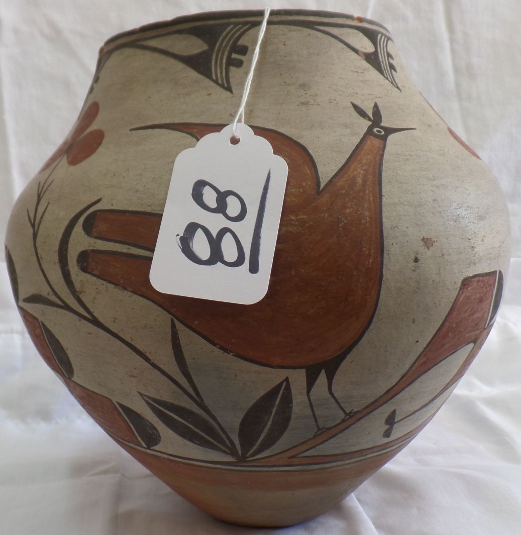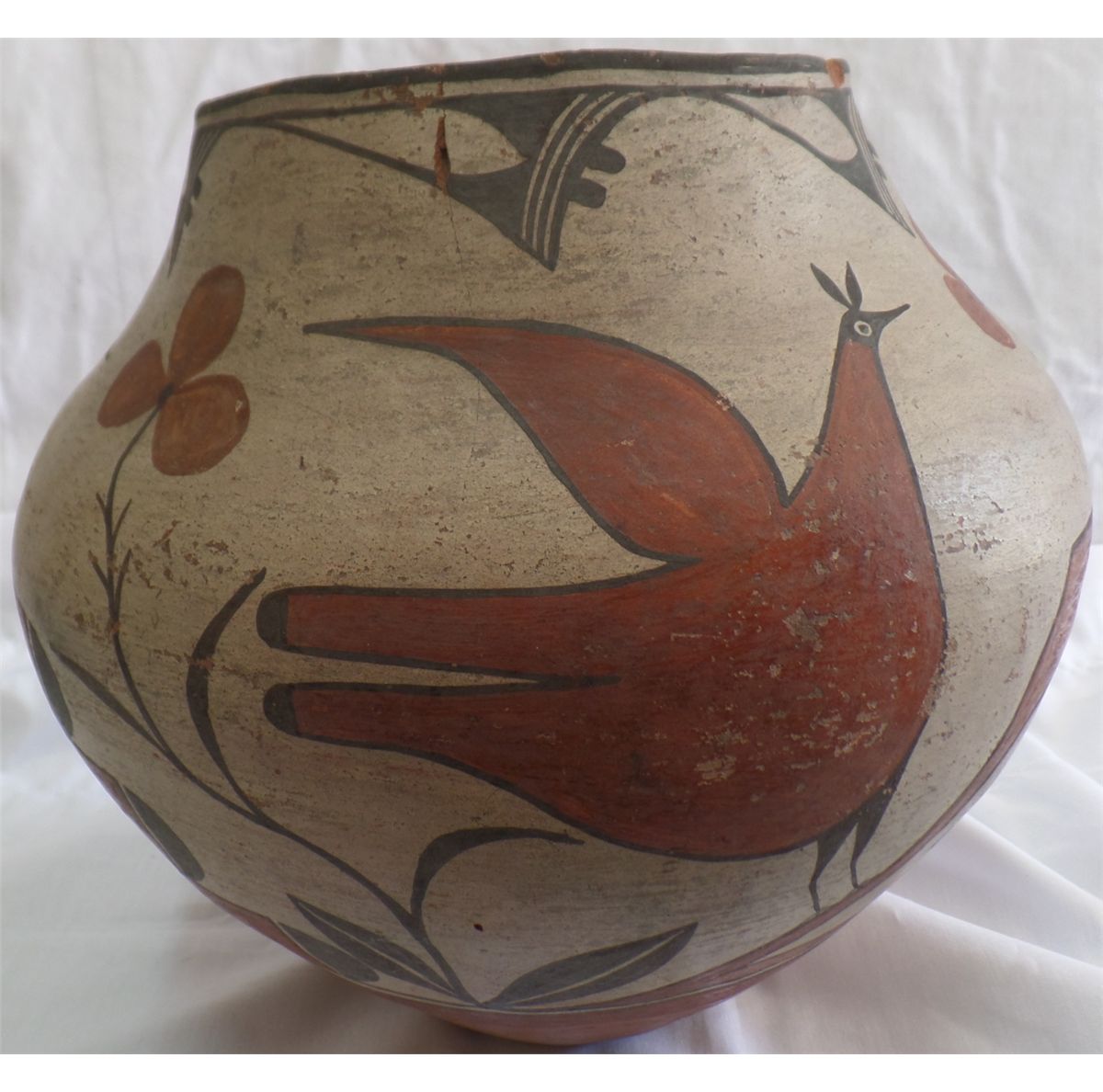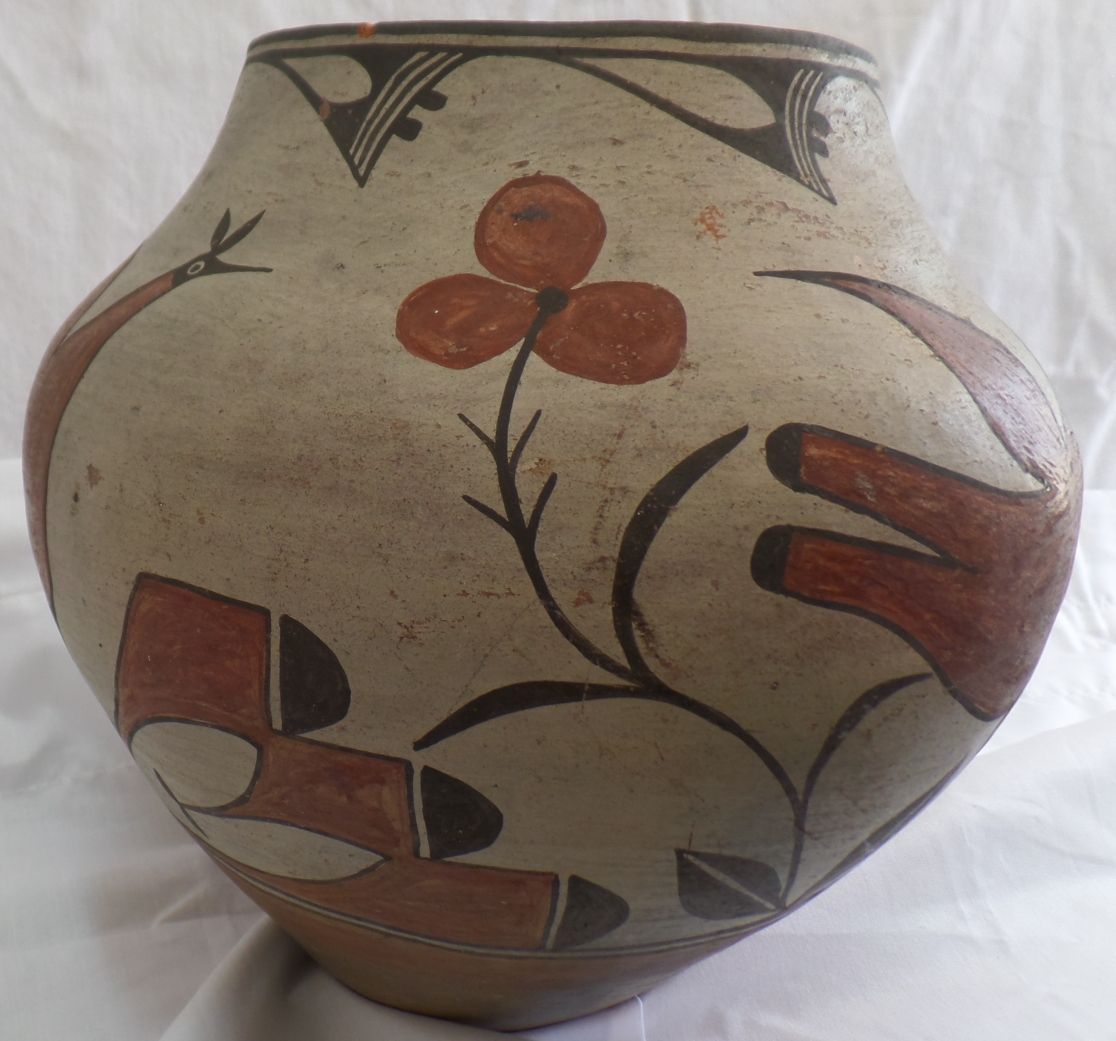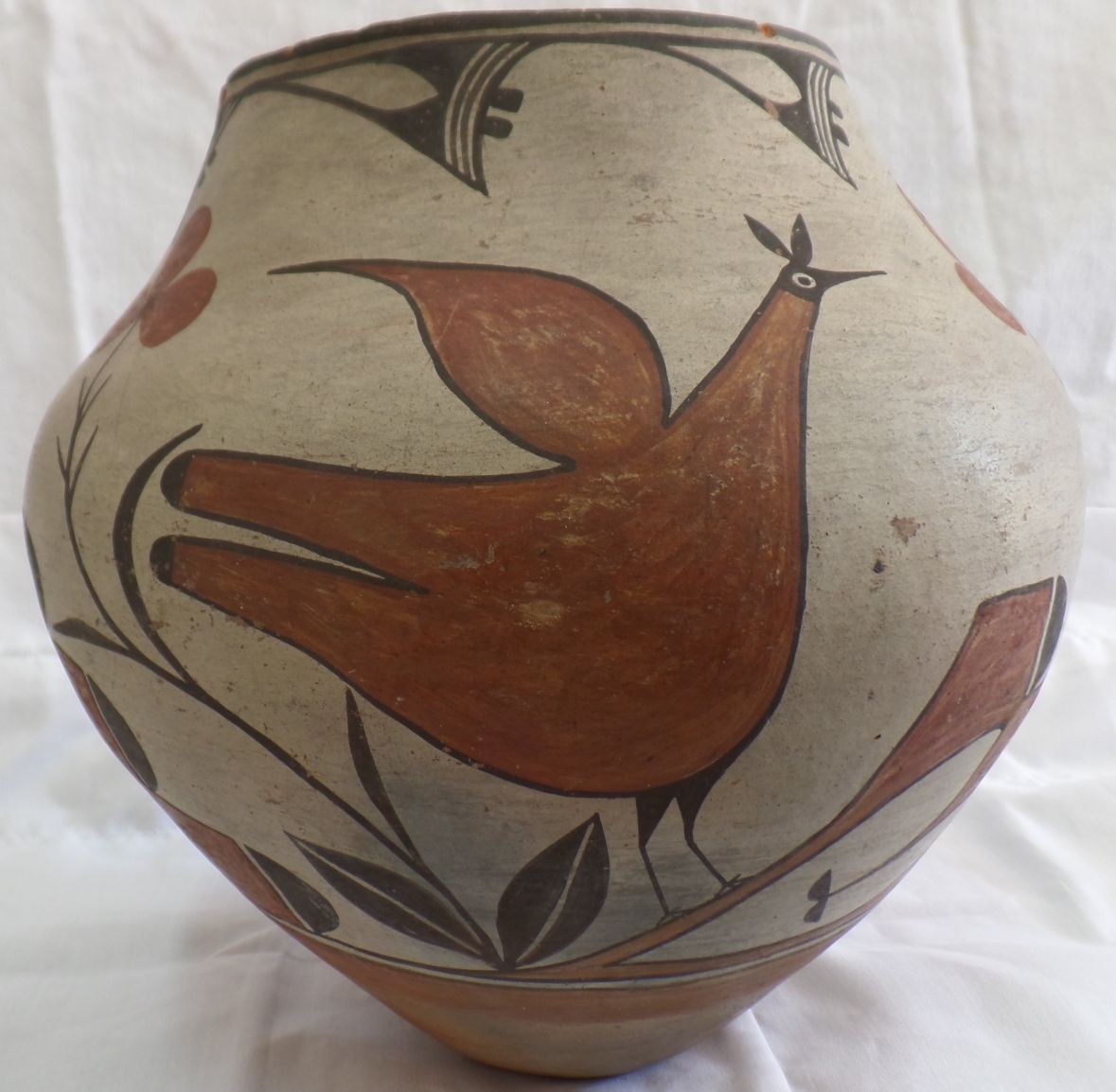 Zia Bird Pot. Measures 12" tall x 6" x 3" and is approx. 33" around at widest point. Item weighs about 4 pounds. Condition: Very Good, The item does have a few chips around the rim, see photos. There are no significant cracks/splits that run the length of the piece. There are a couple light abrasions/scratch marks but having said that, they don't appear to even effect the paint. There is one spot that clearly shows damage, and it is in photo #5. It shows a chip and the beginnings of a crack that span down nearly to the middle portion of the item. The crack appears to be damaging only on the surface. Please see photos. Shipping: $30.