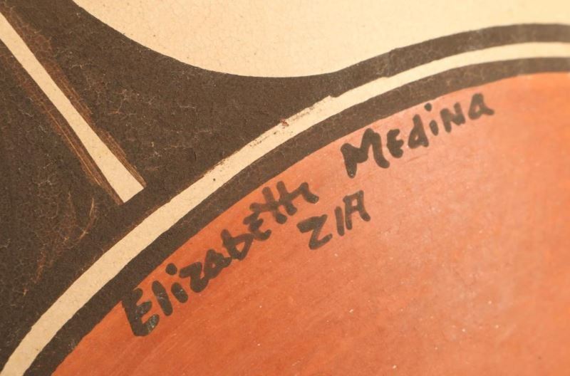 Bird and geometric design signed 'Elizabeth Medina' measures 10 1/2"x12".