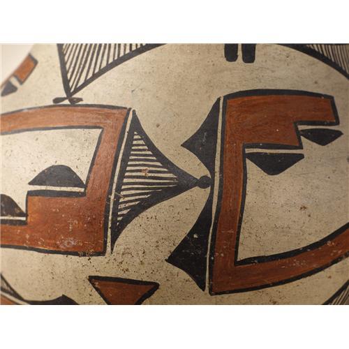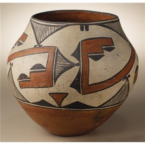<B><I>Zia</B></I> Polychrome Pottery Jar</B></I><BR>Circa 1920<BR>Height 8 1/4 in. Diameter 8 3/4 in.<BR><BR>This olla is characterized by a concave base, flaring sides, a hint of a shoulder, and tapering neck. The body is painted in a single design band of angular step devices surmounted with rain clouds and flanked by hatched feather motifs. The underbody is red with a slip band at the top.<BR><BR>Provenance<BR>Bonhams and Butterfields, Sale 7437E, Lot 5347, June 9, 2003.<BR><BR> <BR><BR><B>Important notic