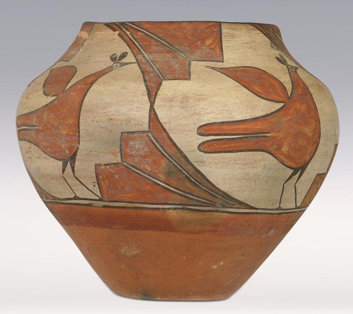 Zia Pot. 10" x 11". Classic bird designs. Red and black on white slip. C. 1910. Condition Report: Shows native use. Minor scratches and rubs from use mostly around rim. Otherwise in sound condition.