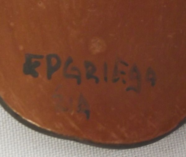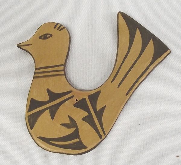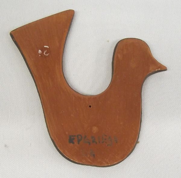 Zia Pottery Bird - EP Griego. Charming little flat bird with a tiny hole on its top, middle that can be used to hang it as an ornament. Signed on the back, ''EPGriego Zia.'' Measures 4''H x 3.5''W.