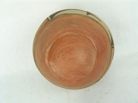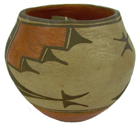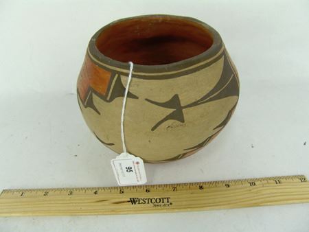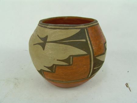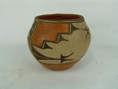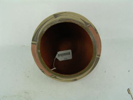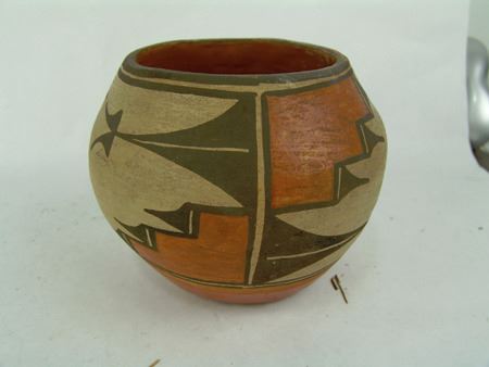 Ca. 1940s, Small older polychrome pottery jar with traditional motif. Good condition. 5" x 5-3/4"