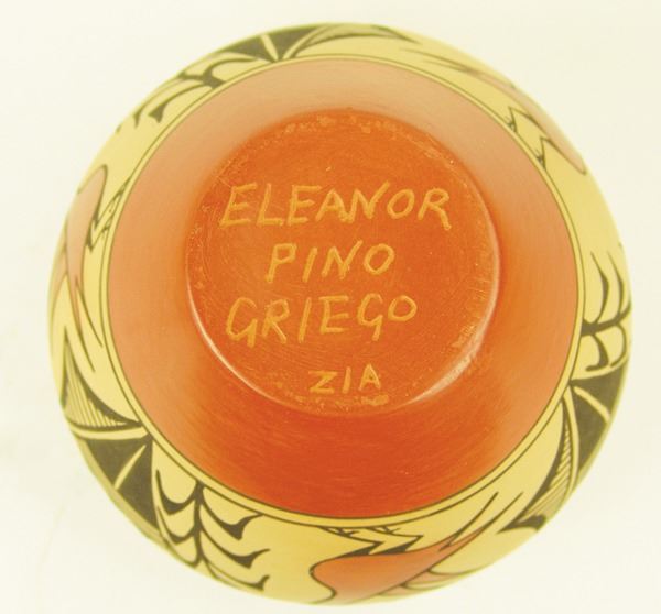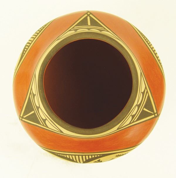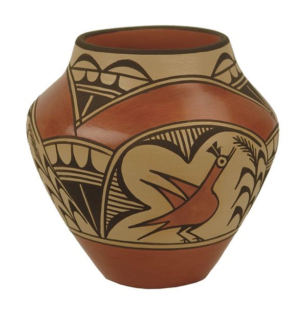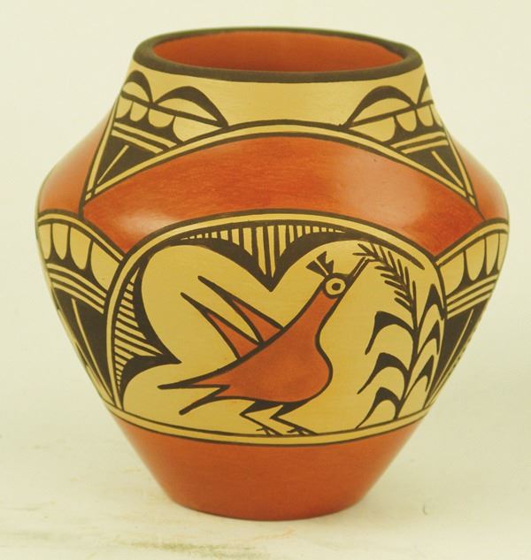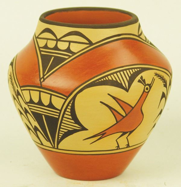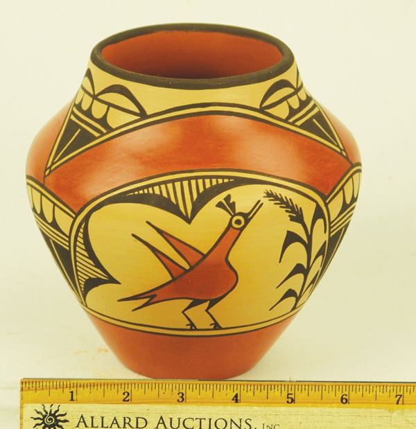 Classic, polychrome pottery jar with bird figures, cornstalks, and other traditional designs. Very good condition, signed.Late 1900s7" x 7"