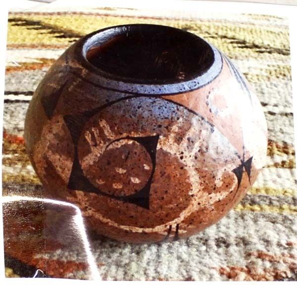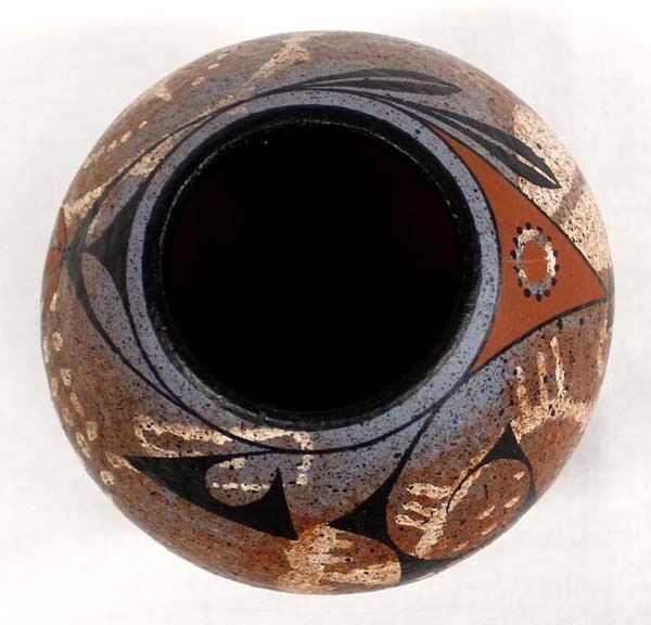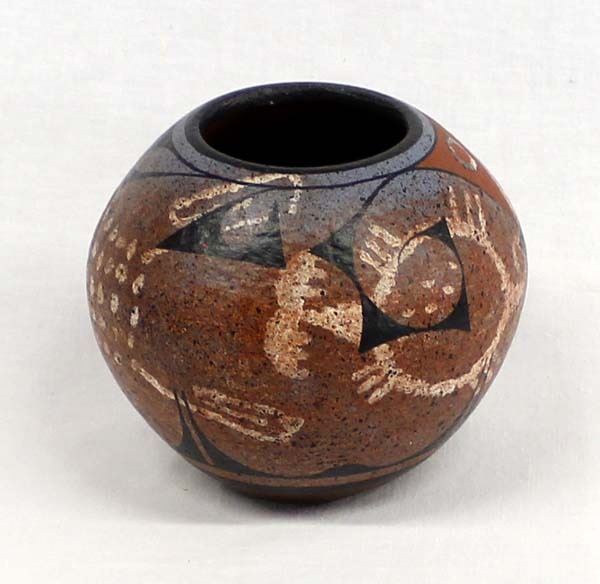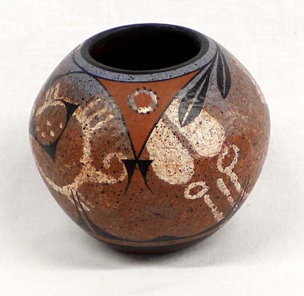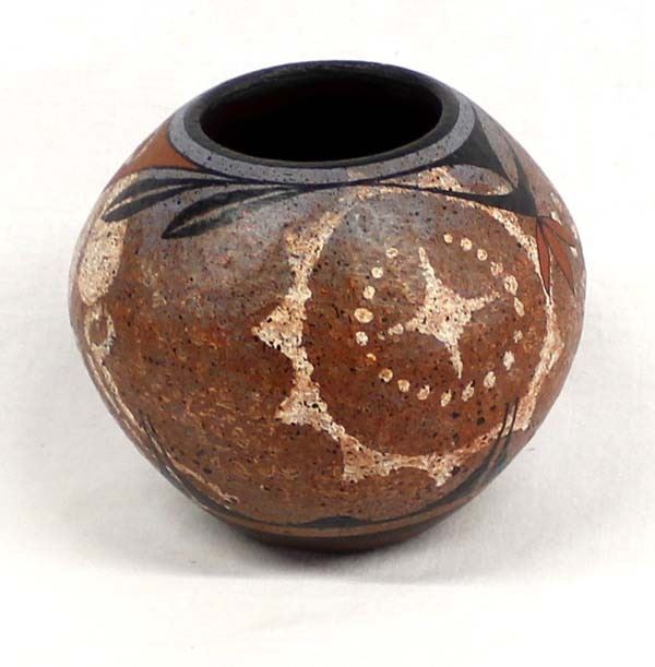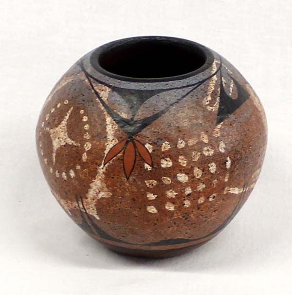 Native American Zia Pottery Jar by Ralph Aragon, measures 4'' x 4'' and is signed on the bottom, ''Ralph Aragon was born at San Felipe, but married into Zia Pueblo. He is credited with creating a new style of painting Pueblo pottery. His designs employ a wide array of symbols, sometimes drawing from ancient rock art. He also uses a spatter technique reminiscent of Joe Herrera and Tony Da, two contemporaries of modern styles.''
