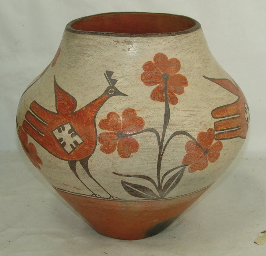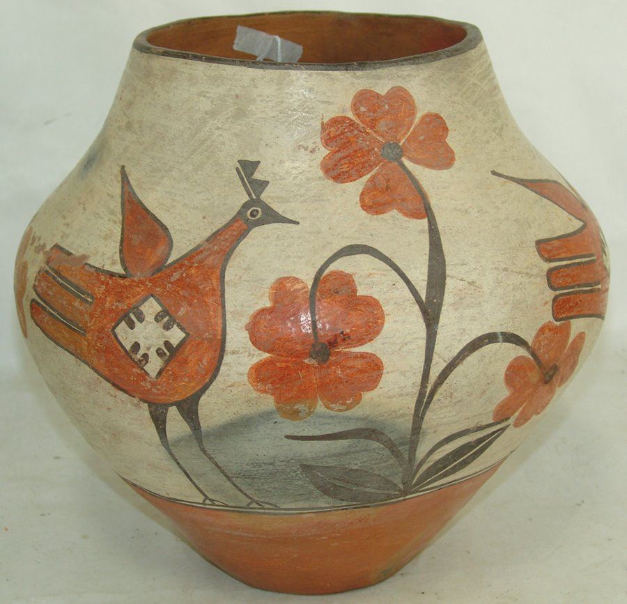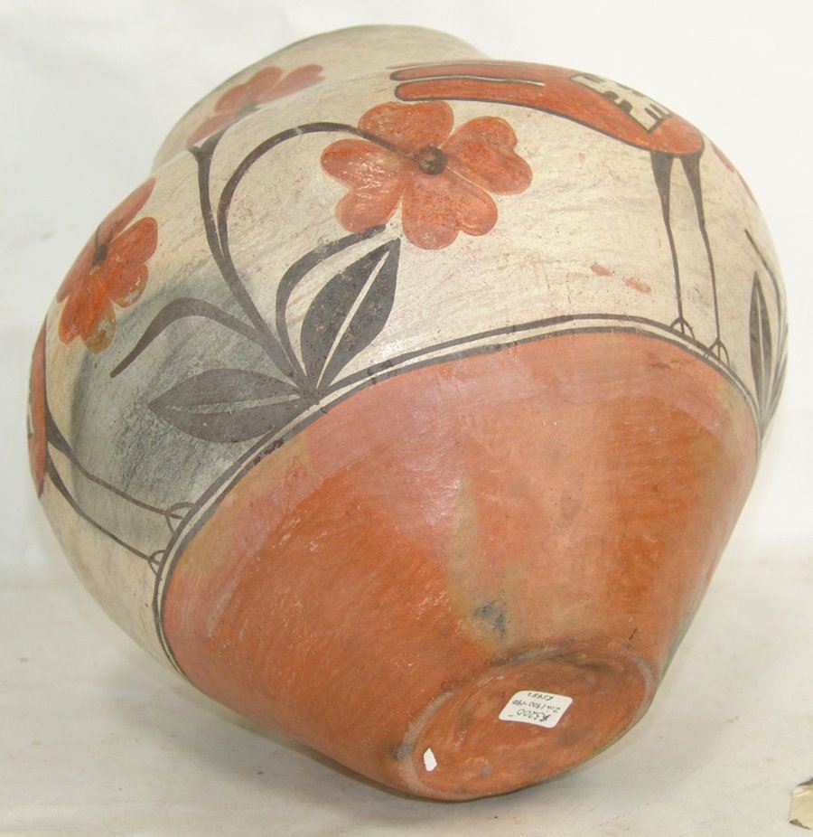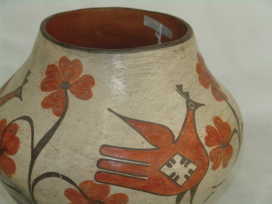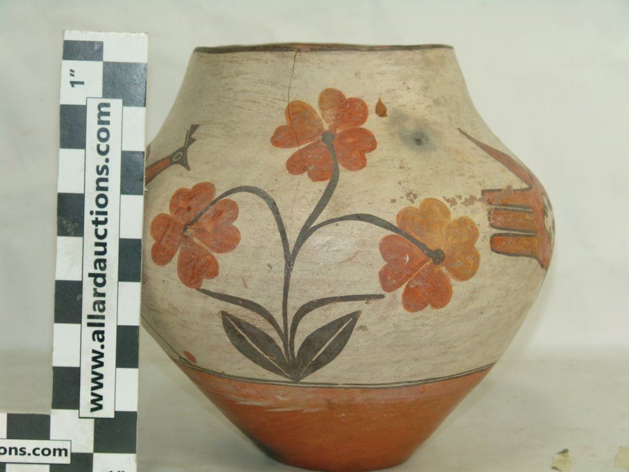 Large, early polychrome jar with wonderful bird and flower figures. Good condition. With glued stress crack from rim, and inside rim chips. Great patina.,Ca. 1900s-1910,11" x 12"