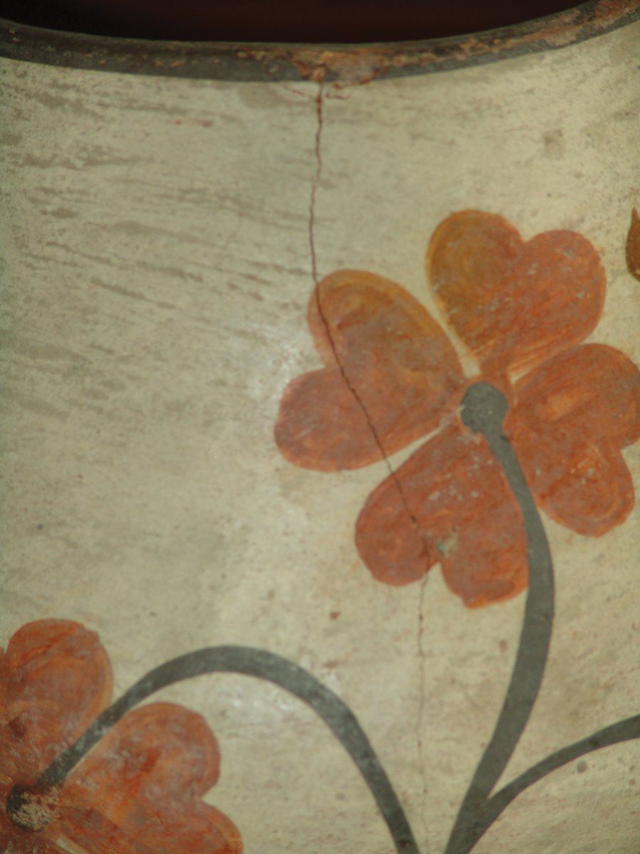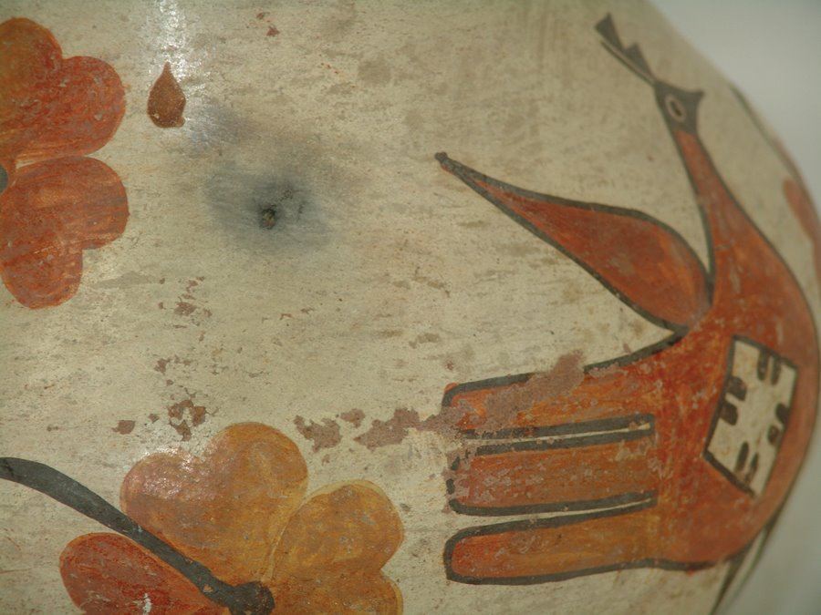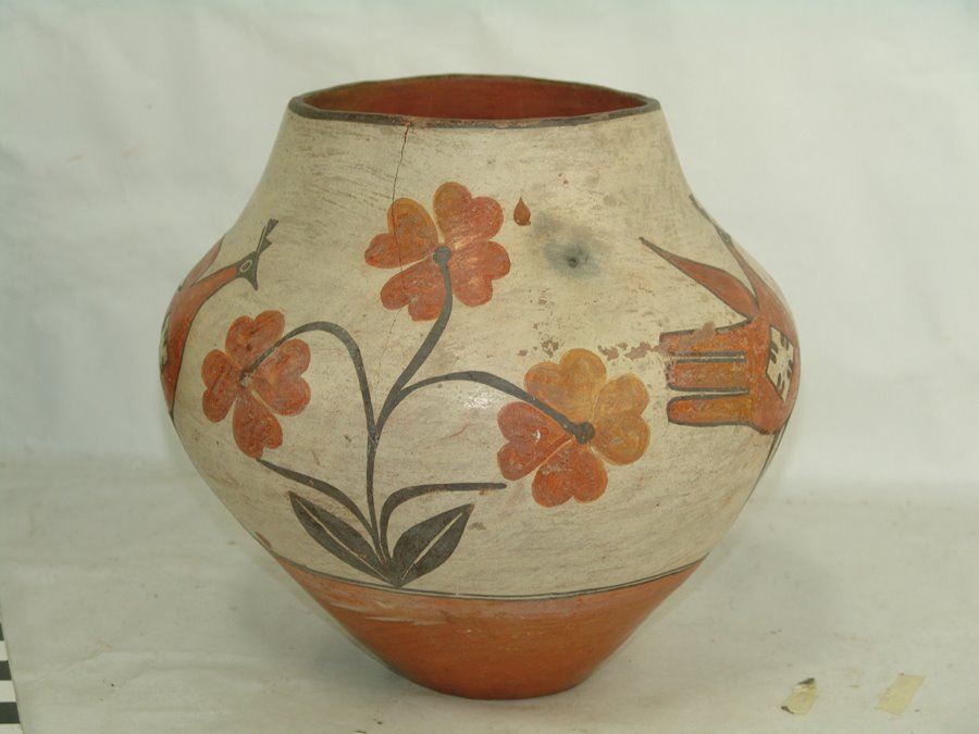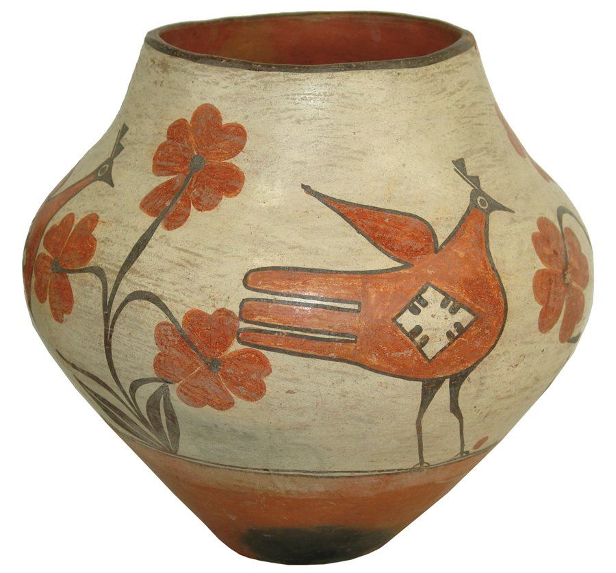 Large, early polychrome jar with wonderful bird and flower figures. Good condition. With glued stress crack from rim, and inside rim chips. Great patina.,Ca. 1900s-1910,11" x 12"