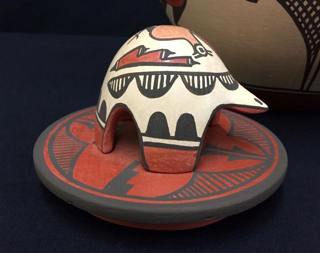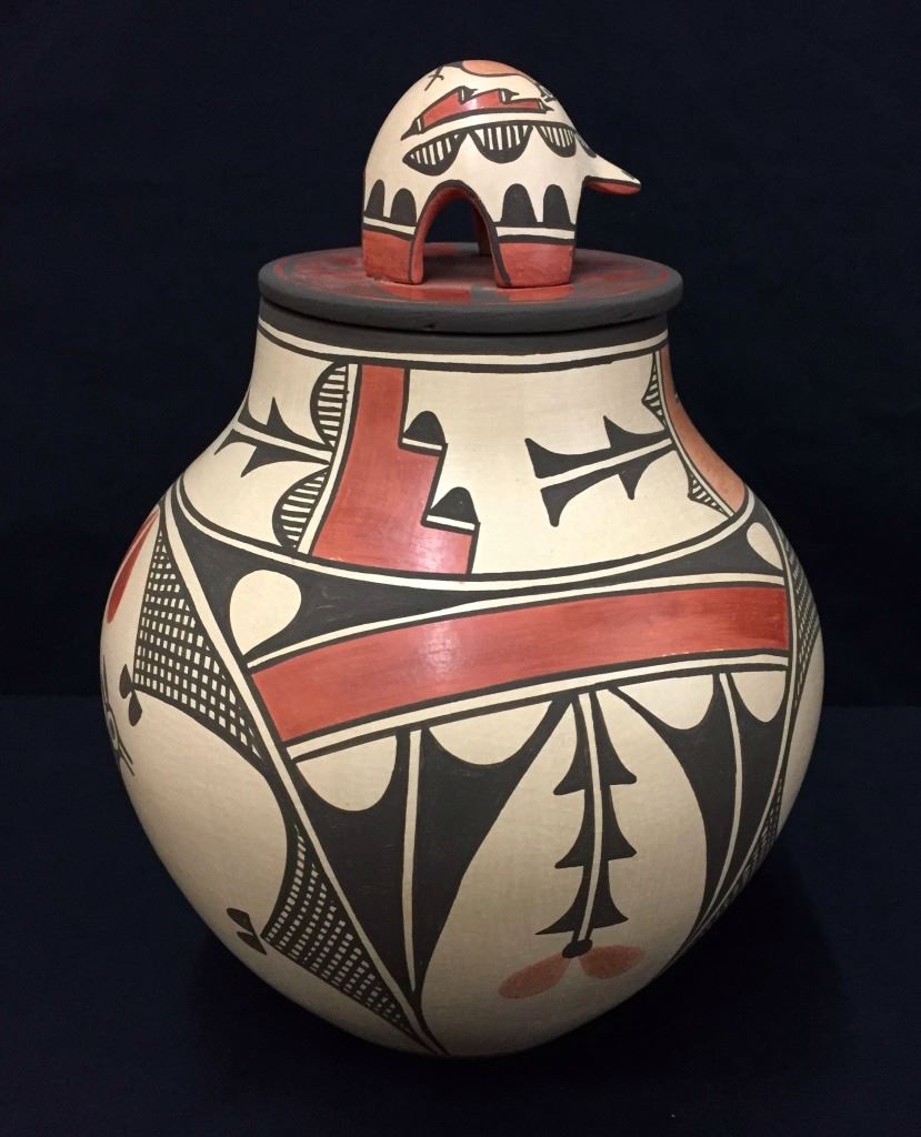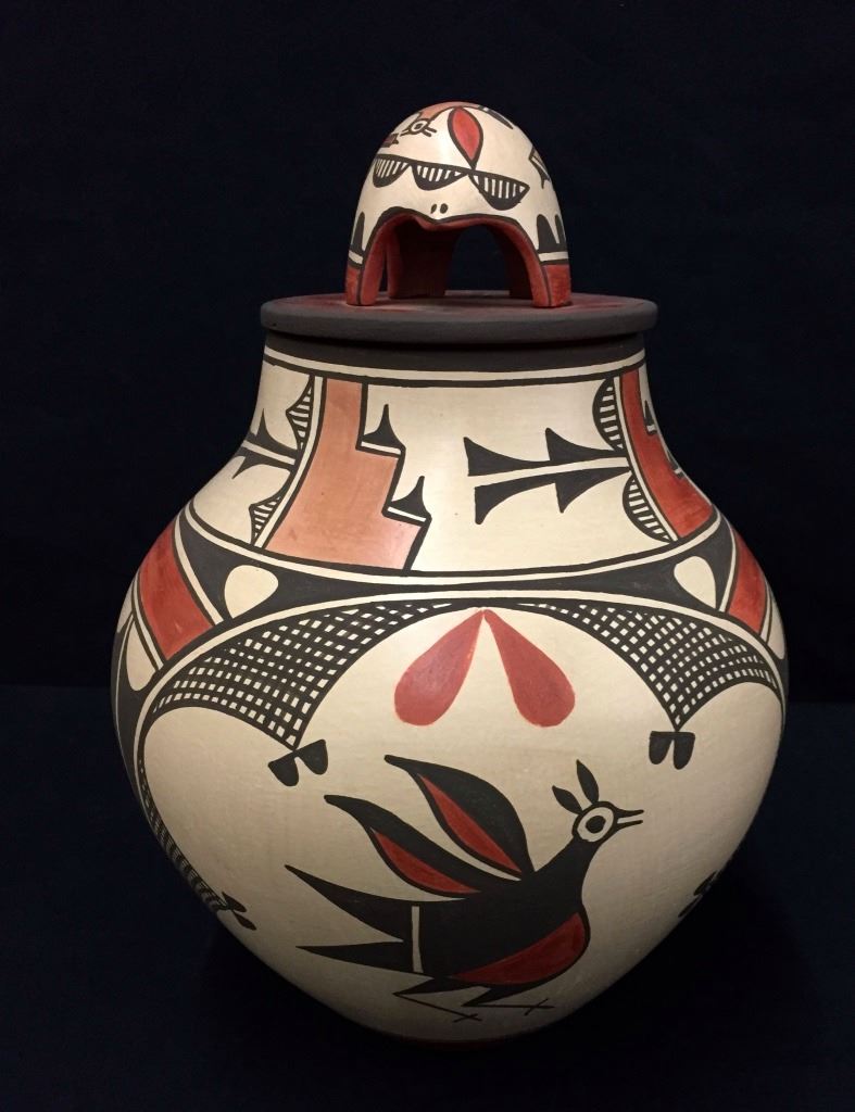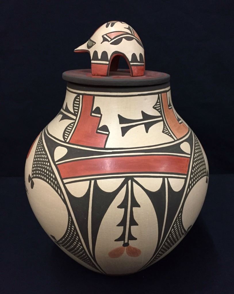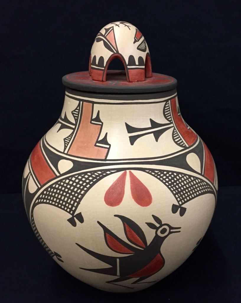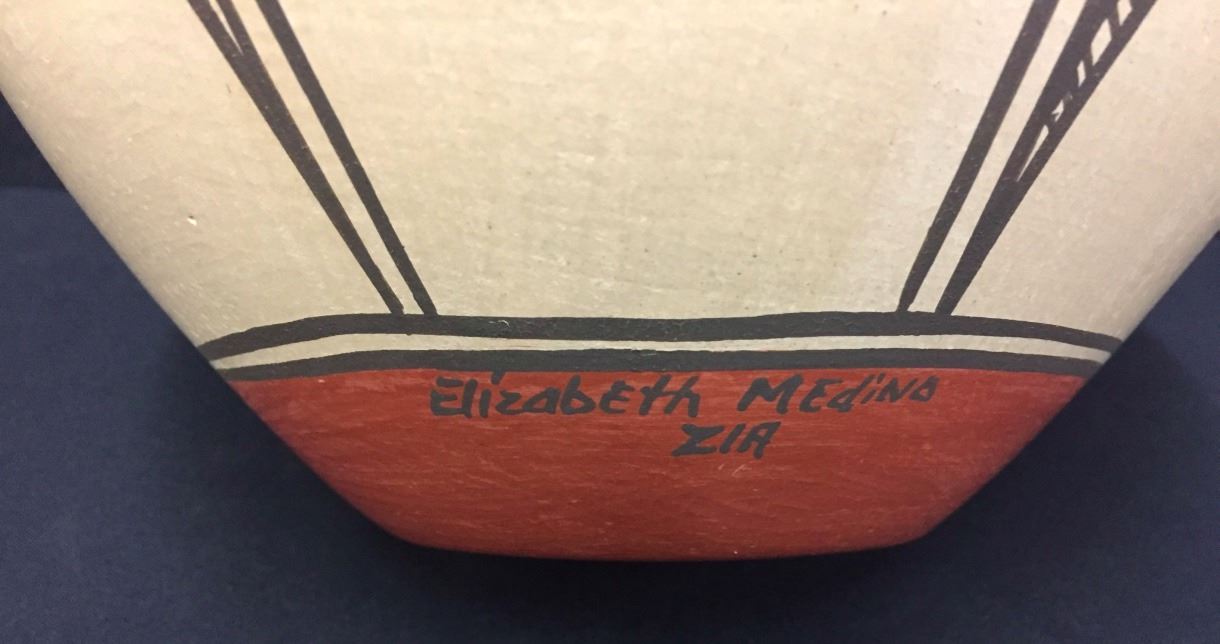 Maker: Elizabeth Medina, Jemez - Zia (b. 1956 - ). Approx. Age: Fairly modern. Size: 13” tall with lid. Condition: Good. Additional Info: Tag on bottom says Elizabeth Medina, who is a well-known Zia potter. Provenance, Janulewicz collection. Please look closely at the pictures - they are an important part of our description. Shipping: There will be a $10 handling / packaging fee for shipping this lot. The actual cost of postage will be added on top of that.