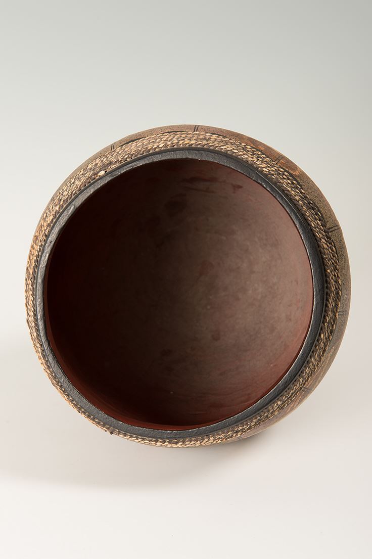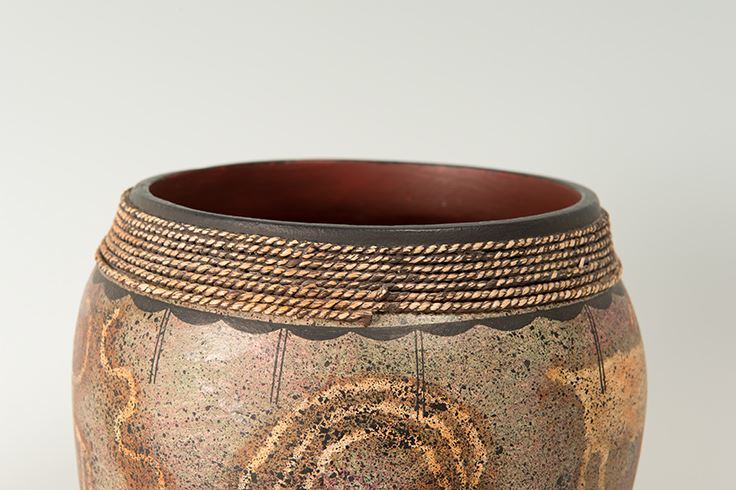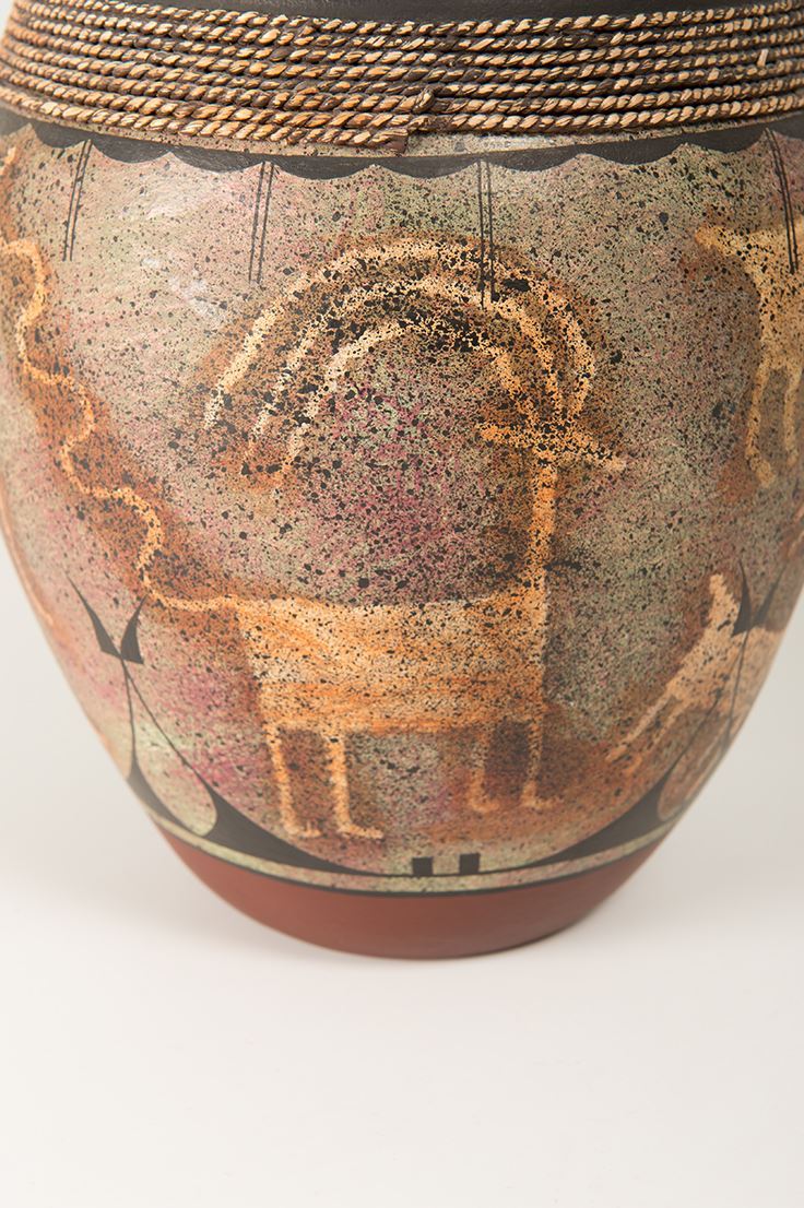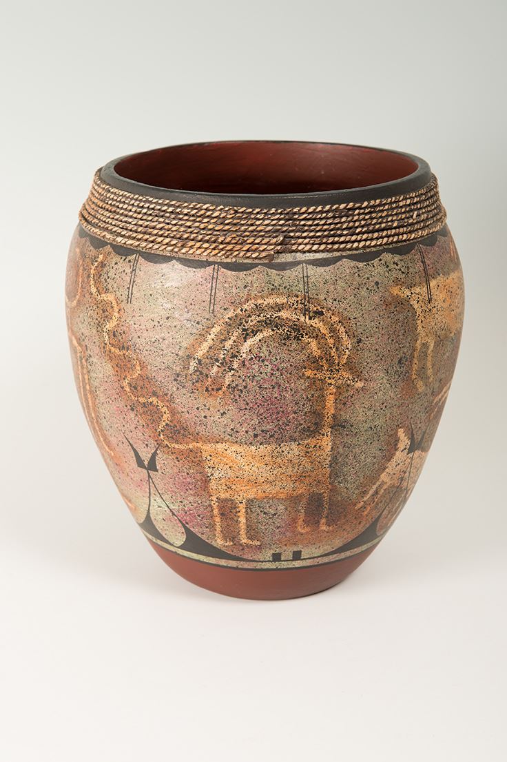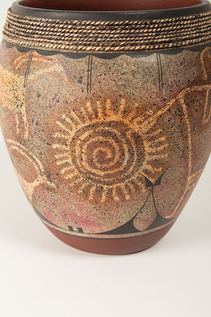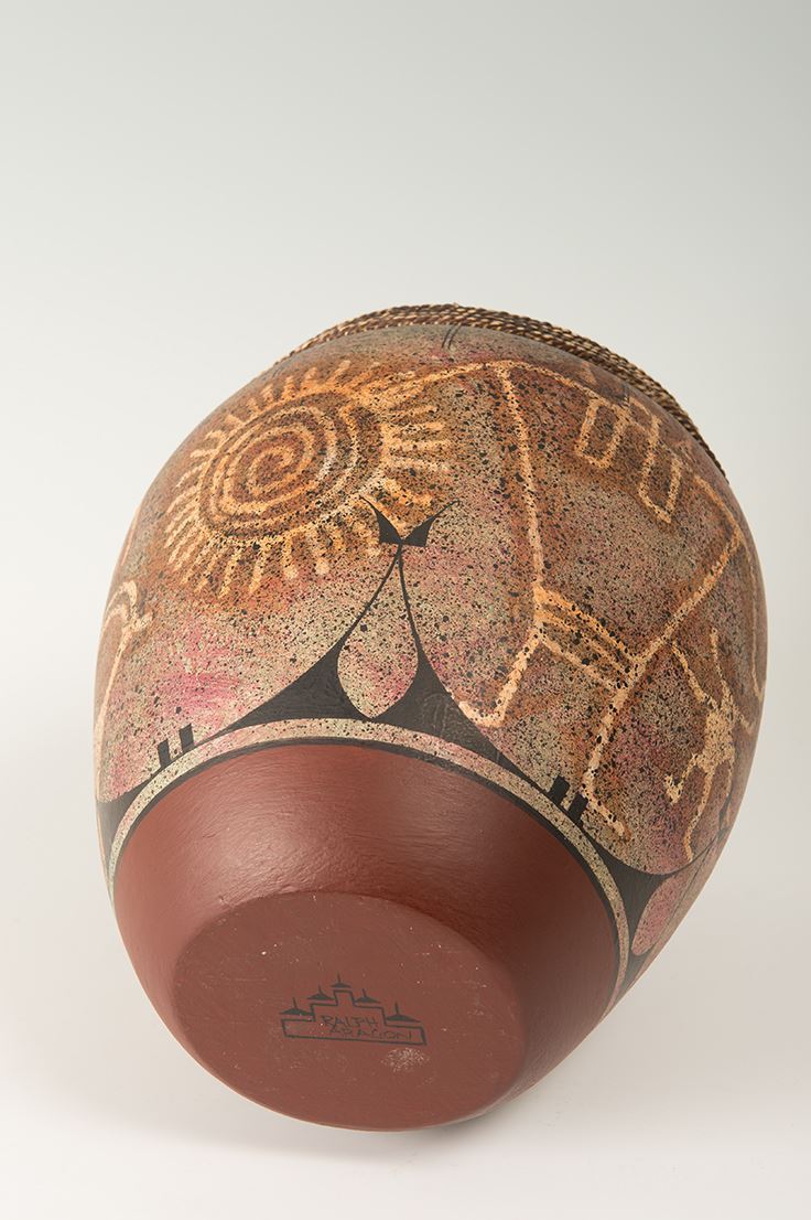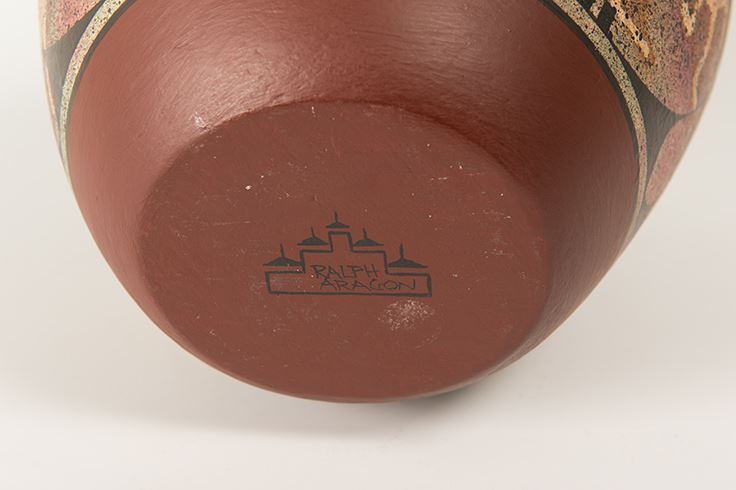 Zia Pueblo Jar by Ralph Aragon. 10 ¼" x 10" with petroglyphic designs and accented with twine around the rim. Signed on bottom: Ralph Aragon.