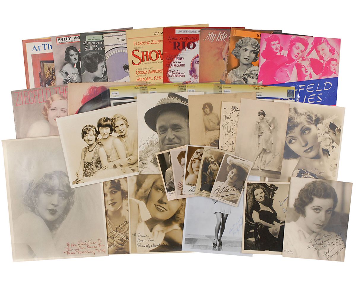 Large collection of items related to the Ziegfeld Follies, consisting primarily of signed and unsigned photos, as well as some other various ephemera. Signed photos include: Will Rogers, Adrienne Ames, Billie Burke, Bebe Daniels, Hazel Dawn, Billie Dove, Pearl Eaton, Peggy Fears, Emma Haig, Anna Held, Ruby Keeler, Lupino Lane, Bessie Love (3), Claire Luce, Dorothy Mackaill, Mae Murray, Mary Nolan, Ann Pennington, and Peggy Shannon. Also includes ink signatures of Florenz Ziegfeld, “Ziegfeld,” and Justine Johnstone, “Good Luck, Justine Johnstone,” on individual album pages. Balance of the lot includes over 40 unsigned photos with subjects including Mae Murray, Florenz Ziegfeld, Marion Davies, Adrienne Ames, Anna Held, Marilyn Miller, Mary Alice Rice, and Gilda Gray; and 11 pieces of ephemera such as programs and sheet music. In overall very good to fine condition.