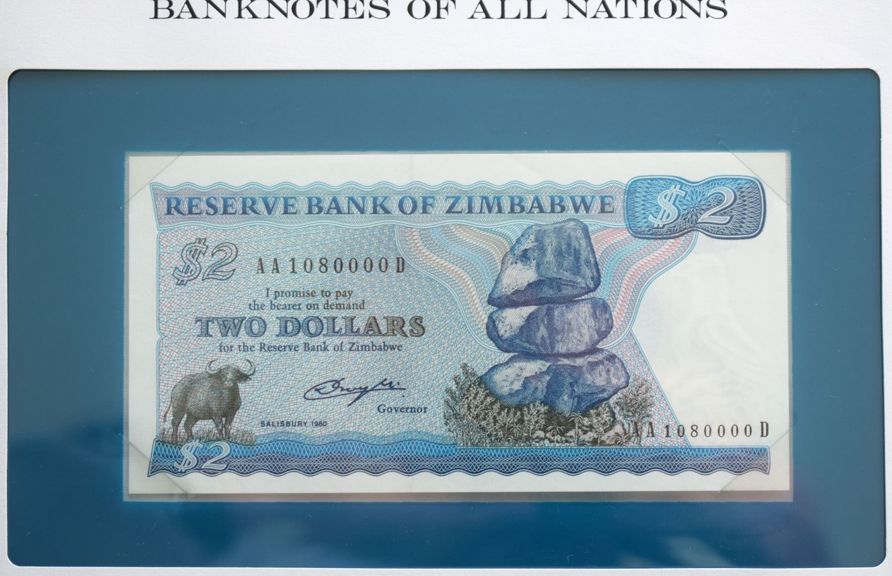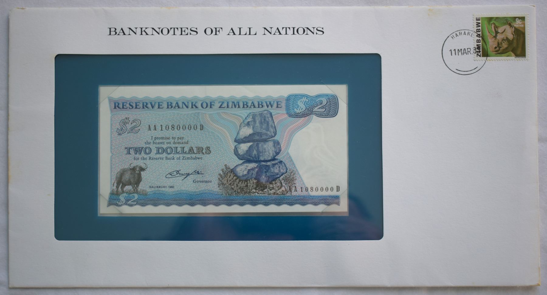 Zimbabwe, $2 1980 Fist Day Cover "Banknotes of all Nations Series" Watermark tupe A Short neck, 1st Issue of the Republic Pick #1 Amazing Condition, Cancelled Harare 1983 Semi Fancy # AA1080000