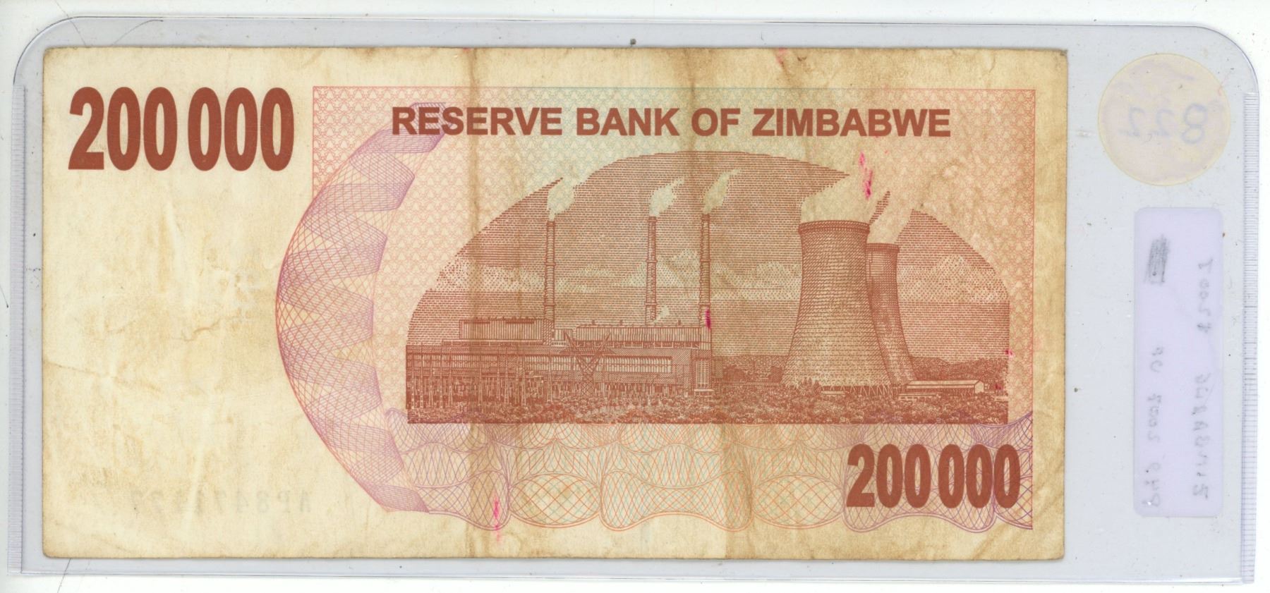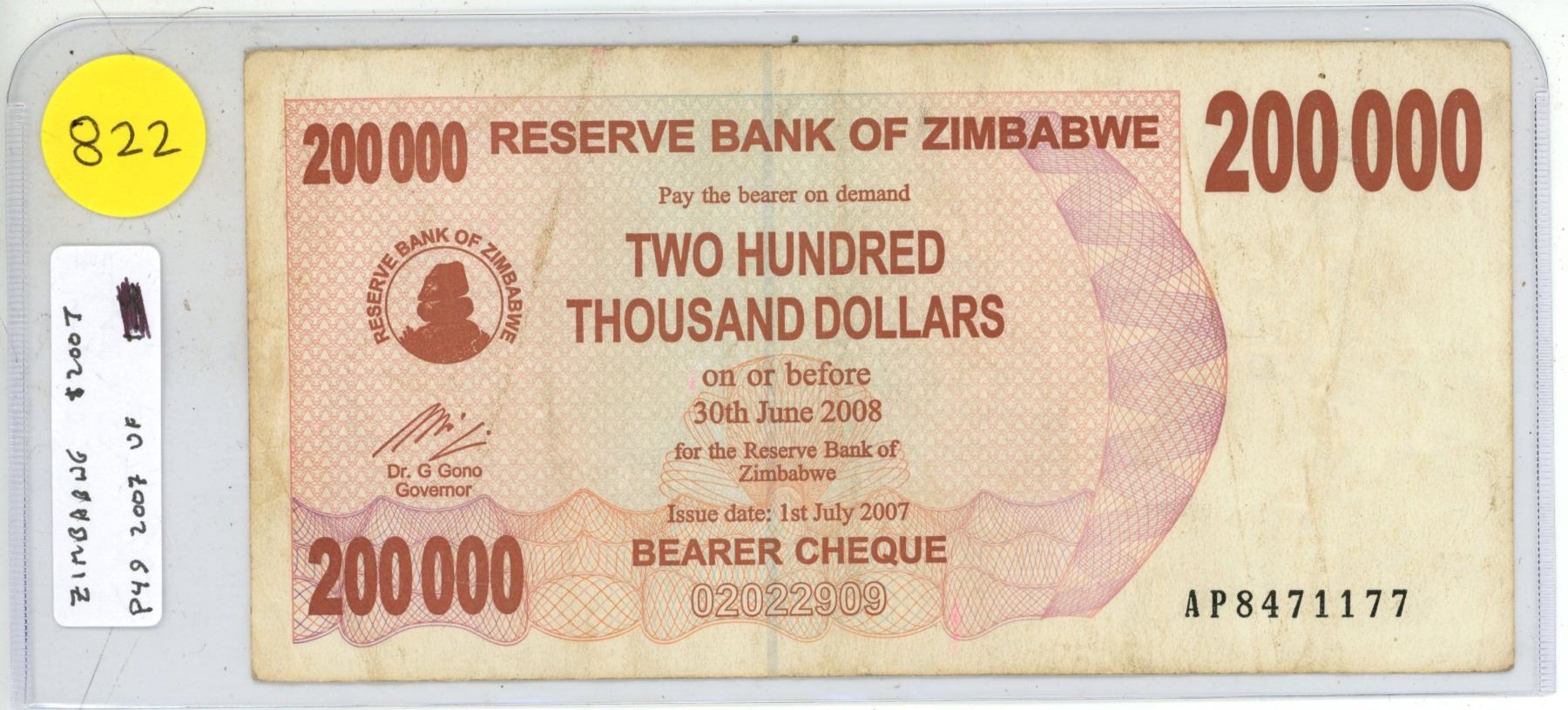 Zimbabwe. 2007 200,000 Dollars Bearer Cheque. Fine Plus.
