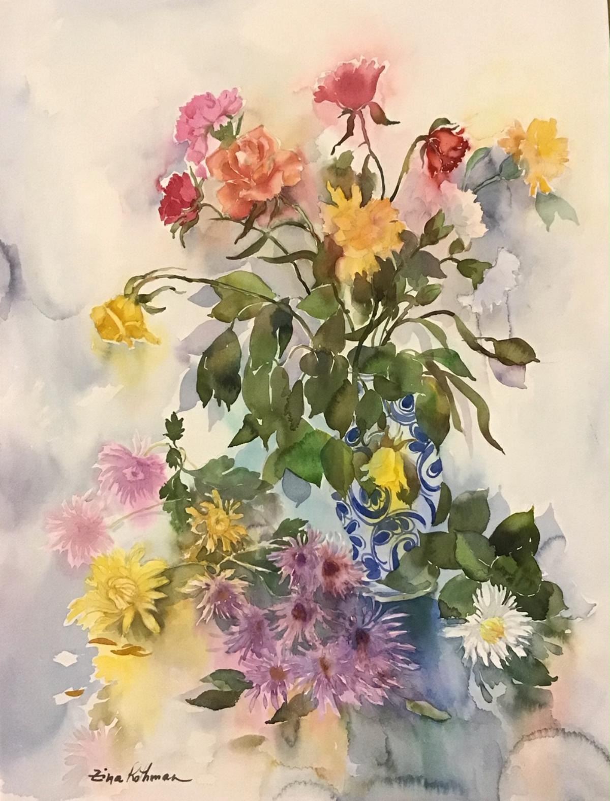 Artist: Zina Roitman. Medium: Original Watercolor. Title: composition with flowers . Size (Unframed): 30" x 25". Certificate of Authenticity: Is included. Reference# 12428.
