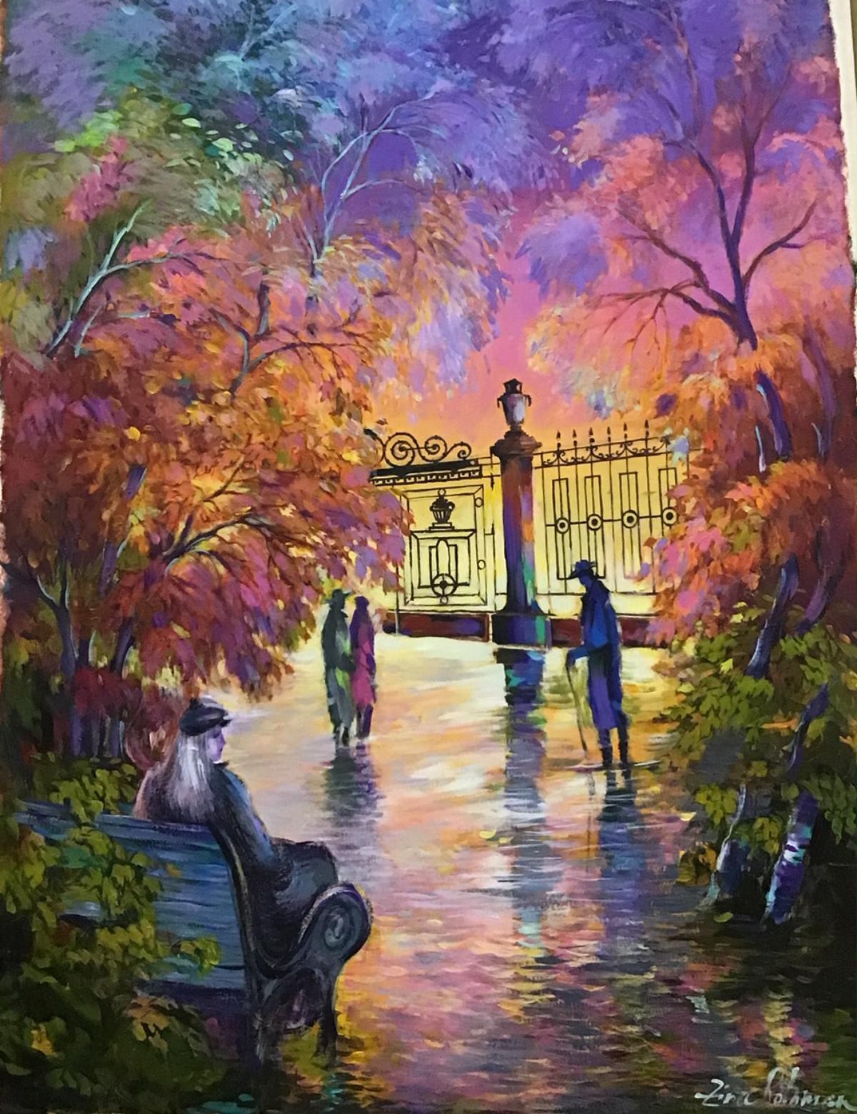 Artist: Zina Roitman. Medium: Original oil on paper. Title: Park at night. Size (Unframed): 29" x 21.5". Certificate of Authenticity: Is included. Reference# 12436.