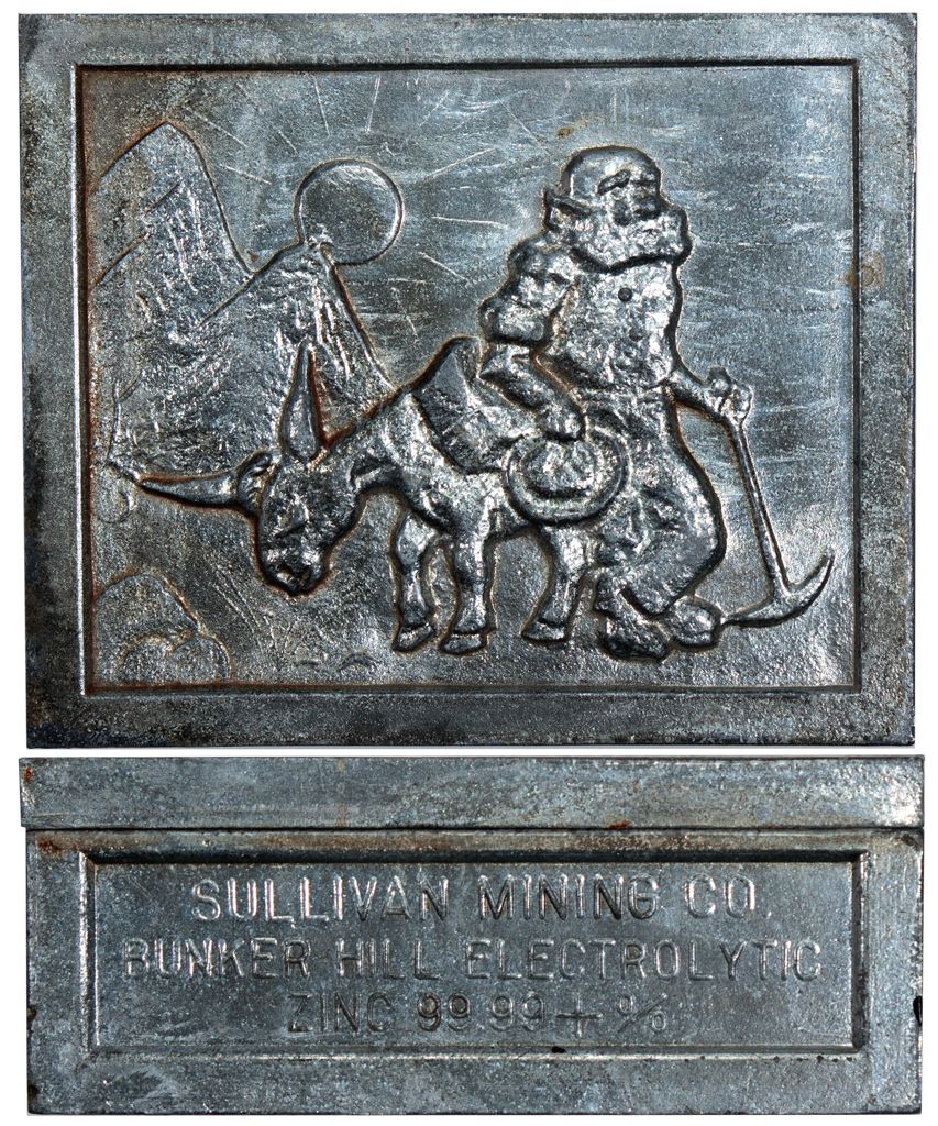 Box measures 4” x 3.25.” and weighs 1.10 pounds. There are two engravings on the box, one is on the side that reads “Sullivan Mining Co. Bunker Electrolytic Zinc 99.99+%.” The other is on the lid and has an image of a prospector and a mule. The box has some and fading. Located in Kellogg, Idaho. The town was named after the prospector Noah Kellogg. Legend has it, that one morning Kellogg's mule wondered off away from camp. Kellogg later found the mule next to a giant piece of galena. Whether or not the story is true is up for debate; never the less, the Sullivan Mining Co. Began operation in the 1880s and was in operation till 1981. [http://travel.nytimes.com/2008/01/18/travel/escapes/18havens.html?scp=1&sq=silver+mountain]. -58866