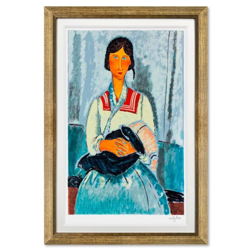 "Zingara Con Bambino" is a framed limited edition serigraph on paper by Amedeo Modigliani. The piece is plate signed and comes with a letter of authenticity. Measures approximately 27" x 25" (frame), 16.5" x 10.5" (image). This item requires special handling and may have a longer than usual turnaround.
