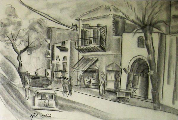 Ziona Tajar, Israeli Art, 1900 - 1988, Old Tel Aviv, Charcoal, 33x48cm, Signed., , , , ,