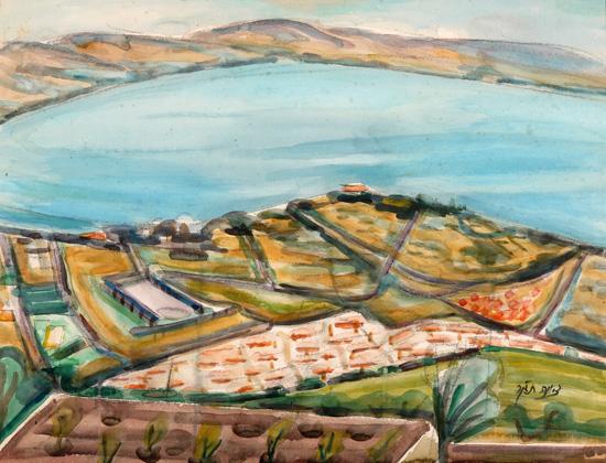 Ziona Tajar, Israeli Art, 1900 - 1988, The Sea of Galilee, Watercolor, 50x64cm, Signed., , , , ,