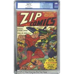 <B>Zip Comics #1 Cosmic Aeroplane pedigree (MLJ, 1940) CGC FN/VF 7.0 Off-white pages.</B></I> The origins of the Scarlet Avenger and Steel Sterling are presented in this issue, which also saw the debuts of Mr. Satan, Captain Valor, the Miracle Man, and the War Eagle. Charles Biro, later of Lev Gleason fame, drew the cover. The interior art is courtesy of Irv Novick. CGC notes, "Small piece of tape on interior cover." Overstreet 2004 FN 6.0 value = $1,491; VF 8.0 value = $3,479. <BR><BR><B>Important notice:</B> Heritage usually auctions material at the rate of 200-250 lots per hour. On some occasions eBay Live bid software or the Internet may not be able to keep up with the pace of the auction. We recommend placing a realistic absentee bid now as insurance to avoid disappointment. Occasionally the auctioneer may eliminate or reject an eBay Live bid, and the auctioneer may also reopen a lot after the close of the eBay live bidding (usually because we missed an audience bid), and may reject your bid even if it shows you as the winning bidder. By bidding via eBay Live, you agree that Heritage may award the lot to another bidder at its sole discretion under the circumstances described above or any other reasonable circumstances. Since eBay bids are not shown to us until we open the lot on the floor, we treat those bids just like floor bids. In most cases the floor responds before the eBay bid is presented to us, due to Internet lag time, so for consistency we have made it a policy that floor bids are always considered first over tie eBay live bids. Also please note that all Heritage lots purchased through eBay Live carry a 20% Buyer's Premium. Please make sure you read the Terms and Conditions before you bid. </span></font></tr></table></td></tr></table>