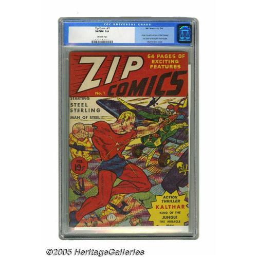 <B>Zip Comics #1 (MLJ, 1940) CGC VF/NM 9.0 Off-white pages.</B></I> Steel Sterling made his first appearance in this issue! The book also has his origin story -- as Ron Goulart wrote in " "<B>Comics Collector</B></I>, Steel ""had an origin that was traumatic enough to have caused the average super-hero to call it quits right then and there."" This issue also has the origin of the Scarlet Avenger (not to be confused with DC's Crimson Avenger). The most notable art in the issue is by Mort Meskin, who drew a story featuring the adventurer known as Captain Valor. Overstreet 2005 VF/NM 9.0 value = $5,661; NM- 9.2 value = $7,800. CGC census 5/05: 2 in 9.0, 1 higher. <BR><BR><B>Important notice:</B> Heritage usually auctions material at the rate of 200-250 lots per hour. On some occasions eBay Live bid software or the Internet may not be able to keep up with the pace of the auction. We recommend placing a realistic absentee bid now as insurance to avoid disappointment. Occasionally the auctioneer may eliminate or reject an eBay Live bid, and the auctioneer may also reopen a lot after the close of the eBay live bidding (usually because we missed an audience bid), and may reject your bid even if it shows you as the winning bidder. By bidding via eBay Live, you agree that Heritage may award the lot to another bidder at its sole discretion under the circumstances described above or any other reasonable circumstances. Since eBay bids are not shown to us until we open the lot on the floor, we treat those bids just like floor bids. In most cases the floor responds before the eBay bid is presented to us, due to Internet lag time, so for consistency we have made it a policy that floor bids are always considered first over tie eBay live bids. Also please note that all Heritage lots purchased through eBay Live carry a 20% Buyer's Premium. Please make sure you read the Terms and Conditions before you bid. This lot is being auctioned in conjunction with a live floor auction by Heritag