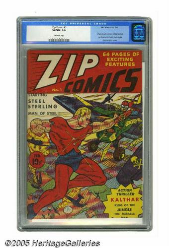 <B>Zip Comics #1 (MLJ, 1940) CGC VF/NM 9.0 Off-white pages.</B></I> This issue has the origins and first appearances of Steel Sterling (who was the first "Man of Steel" according to some) and the Scarlet Avenger. There's interior art by Mort Meskin, who drew a story featuring the adventurer known as Captain Valor. Overstreet 2005 VF/NM 9.0 value = $5,661; NM- 9.2 value = $7,800. CGC census 5/05: 2 in 9.0, 1 higher.