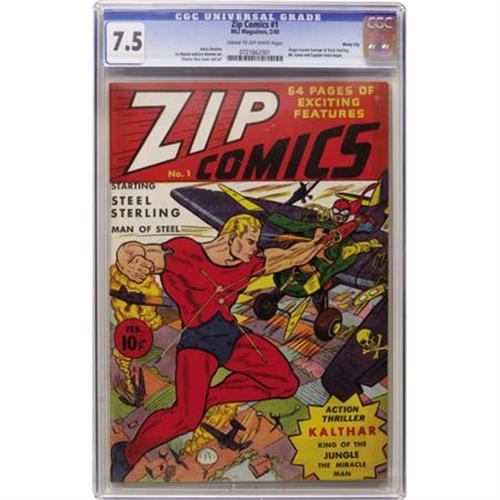 <B>Zip Comics #1 Windy City pedigree (MLJ, 1940) CGC VF- 7.5 Cream to off-white pages.</B></I> Those early MLJ comics were sure loaded with great superhero fare like this issue's Steel Sterling cover, drawn by Charles Biro. Origin stories of the Scarlet Avenger, Kalthar the Giant Man, and Steel, as well as the debuts of Mr. Satan and Captain Valor, make this book a real winner. This title has long been a favorite with Golden Age collectors, and with this exceptionally nice copy of the first issue, it's easy to see why. Other than some mild dust shadowing, it looks almost as fresh as the day it sold for a thin silver dime! Overstreet 2007 VF 8.0 value = $3,542. CGC census 6/07: 2 in 7.5, 4 higher.<BR><BR><b>Shipping:</b> Comics - Slabbed (certified) (<a target="_blank" href="http://www.heritageauctions.com/common/shipping.php">view shipping information</a>)