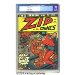 Zip Comics #10 (MLJ, 1941) CGC VG 4.0 Off-white to white pages. Charles Biro cover. Biro and Mort Meskin art. Overstreet 2003 VG 4.0 value = $260. Important notice: Heritage usually auctions material at the rate of 200-250 lots per hour. On some occasions eBay Live bid software or the Internet may not be able to keep up with the pace of the auction. We recommend placing a realistic absentee bid now as insurance to avoid disappointment. Occasionally the auctioneer may eliminate or reject an eBay Live bid, and the auctioneer may also reopen a lot after the close of the eBay live bidding (usually because we missed an audience bid), and may reject your bid even if it shows you as the winning bidder. By bidding via eBay Live, you agree that Heritage may award the lot to another bidder at its sole discretion under the circumstances described above or any other reasonable circumstances. Since eBay bids are not shown to us until we open the lot on the floor, we treat those bids just like floor bids. In most cases the floor responds before the eBay bid is presented to us, due to Internet lag time, so for consistency we have made it a policy that floor bids are always considered first over tie eBay live bids. Also please note that all Heritage lots purchased through eBay Live carry a 20% Buyer's Premium. Please make sure you read the Terms and Conditions before you bid.
