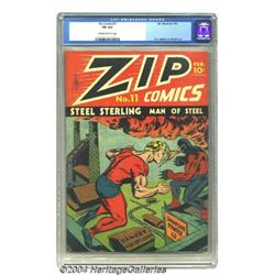 Zip Comics #11 (MLJ, 1941) CGC FN 6.0 Off-white to white pages. Charles Biro cover. Biro, Irv Novick, and Mort Meskin art. Overstreet 2003 FN 6.0 value = $294. Important notice: Heritage usually auctions material at the rate of 200-250 lots per hour. On some occasions eBay Live bid software or the Internet may not be able to keep up with the pace of the auction. We recommend placing a realistic absentee bid now as insurance to avoid disappointment. Occasionally the auctioneer may eliminate or reject an eBay Live bid, and the auctioneer may also reopen a lot after the close of the eBay live bidding (usually because we missed an audience bid), and may reject your bid even if it shows you as the winning bidder. By bidding via eBay Live, you agree that Heritage may award the lot to another bidder at its sole discretion under the circumstances described above or any other reasonable circumstances. Since eBay bids are not shown to us until we open the lot on the floor, we treat those bids just like floor bids. In most cases the floor responds before the eBay bid is presented to us, due to Internet lag time, so for consistency we have made it a policy that floor bids are always considered first over tie eBay live bids. Also please note that all Heritage lots purchased through eBay Live carry a 20% Buyer's Premium. Please make sure you read the Terms and Conditions before you bid.