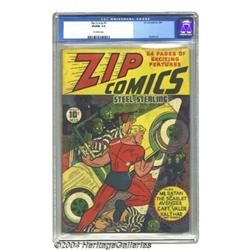 Zip Comics #2 (MLJ, 1940) CGC VG/FN 5.0 Off-white pages. One of the earliest "Archie" (MLJ) titles featured Steel Sterling as the lead superhero, among a plethora that included Mr. Satan, the Scarlet Avenger, Captain Valor, and Kalthar. Mort Meskin provided interior art, in one of his earlier comic stints. Overstreet 2003 VG 4.0 value = $452; FN 6.0 value = $678. Important notice: Heritage usually auctions material at the rate of 200-250 lots per hour. On some occasions eBay Live bid software or the Internet may not be able to keep up with the pace of the auction. We recommend placing a realistic absentee bid now as insurance to avoid disappointment. Occasionally the auctioneer may eliminate or reject an eBay Live bid, and the auctioneer may also reopen a lot after the close of the eBay live bidding (usually because we missed an audience bid), and may reject your bid even if it shows you as the winning bidder. By bidding via eBay Live, you agree that Heritage may award the lot to another bidder at its sole discretion under the circumstances described above or any other reasonable circumstances. Since eBay bids are not shown to us until we open the lot on the floor, we treat those bids just like floor bids. In most cases the floor responds before the eBay bid is presented to us, due to Internet lag time, so for consistency we have made it a policy that floor bids are always considered first over tie eBay live bids. Also please note that all Heritage lots purchased through eBay Live carry a 20% Buyer's Premium. Please make sure you read the Terms and Conditions before you bid.