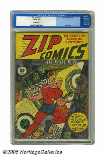 <B>Zip Comics #2 (MLJ, 1940) CGC VG/FN 5.0 Off-white pages.</B></I> Steel Sterling, "The Man of Steel," was the star of this multi-character comic. There's also a Captain Valor story with Mort Meskin art, plus an adventure of Western hero Nevada Jones (who, we hasten to add, appeared more than 20 years before novelist Harold Robbins came up with Nevada <I>Smith</B></I>). While this copy's grade may seem to be nothing special, note that only one copy has been graded higher by CGC as of this writing. Overstreet 2005 VG 4.0 value = $476; FN 6.0 value = $714. CGC census 5/05: 1 in 5.0, 1 higher.