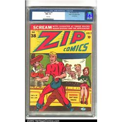 Zip Comics #38 Mile High pedigree (MLJ, 1943).  If you want a Mile High that embodies everything that is legendary about their quality, this is the book for you. Practically flawless, this copy is white throughout, and looks like it came off the newsstand last week. Add to that classic Mort Sahl art and a Steel Sterling cover, and you have a true gem. CGC NM+ 9.6 White pages. Overstreet 2001 NM 9.4 value = $425.  Important notice: We expect to be auctioning lots at the rate of 200-250 per hour. Sometimes eBay Premier live bid software cannot keep up with that pace, so we strongly recommend that you place a realistic proxy bid now as insurance to avoid disappointment. Also please note that all Heritage/CAA lots purchased through eBay Premier carry a 20% Buyer's Premium.