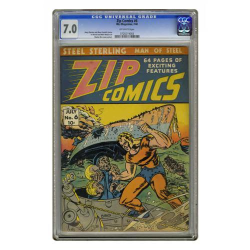 <B>Zip Comics #6 (MLJ, 1940) CGC FN/VF 7.0 Off-white pages.</B></I> While Charles Biro is one of the all-time great comic book writers, he was strictly an artist on this series, drawing the cover and the Steel Sterling feature. Also appearing were the Scarlet Avenger (drawn by Irv Novick), Captain Valor (drawn by Mort Meskin), and Mr. Satan (who despite his name was a good guy). Overstreet 2005 FN 6.0 value = $405; VF 8.0 value = $844. CGC census 12/05: 1 in 7.0, 3 higher.